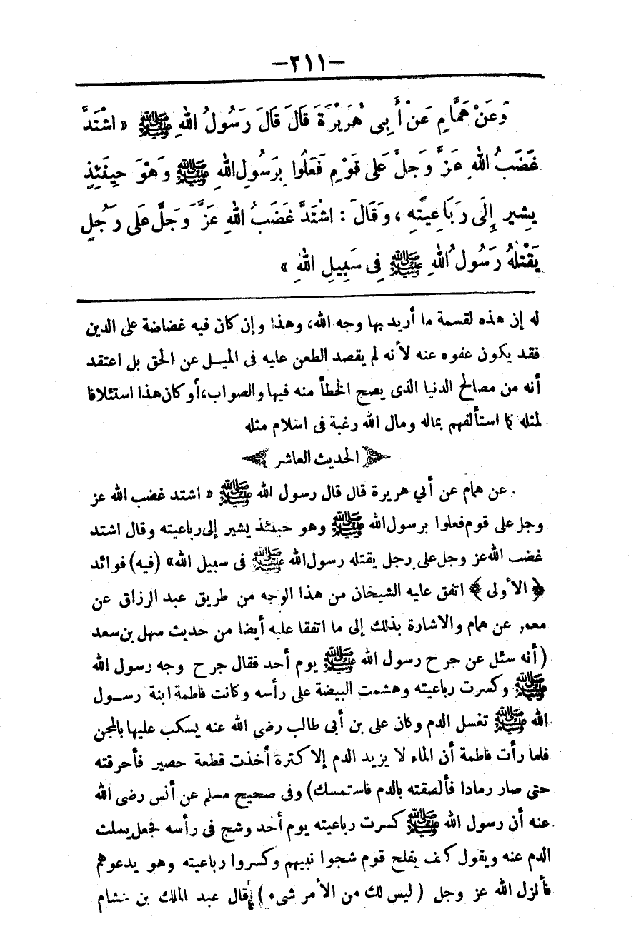 الْحَدِيثُ الْعَاشِرُ عَنْ هَمَّامٍ عَنْ أَبِي هُرَيْرَةَ قَالَ قَالَ رَسُولُ اللَّهِ - صَلَّى اللَّهُ عَلَيْهِ وَسَلَّمَ - «اشْتَدَّ غَضَبُ اللَّهِ عَزَّ وَجَلَّ عَلَى قَوْمٍ فَعَلُوا بِرَسُولِ اللَّهِ - صَلَّى اللَّهُ عَلَيْهِ وَسَلَّمَ -، وَهُوَ حِينَئِذٍ يُشِيرُ إلَى رَبَاعِيَتِهِ، وَقَالَ اشْتَدَّ غَضَبُ اللَّهِ عَزَّ وَجَلَّ عَلَى رَجُلٍ يَقْتُلُهُ رَسُولُ اللَّهِ - صَلَّى اللَّهُ عَلَيْهِ وَسَلَّمَ - فِي سَبِيلِ اللَّهِ» . (فِيهِ) فَوَائِدُ: