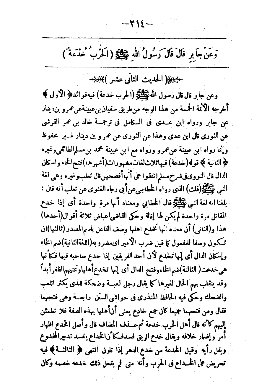 وَعَنْ جَابِرٍ قَالَ قَالَ رَسُولُ اللَّهِ - صَلَّى اللَّهُ عَلَيْهِ وَسَلَّمَ - «الْحَرْبُ خُدْعَةٌ» ..