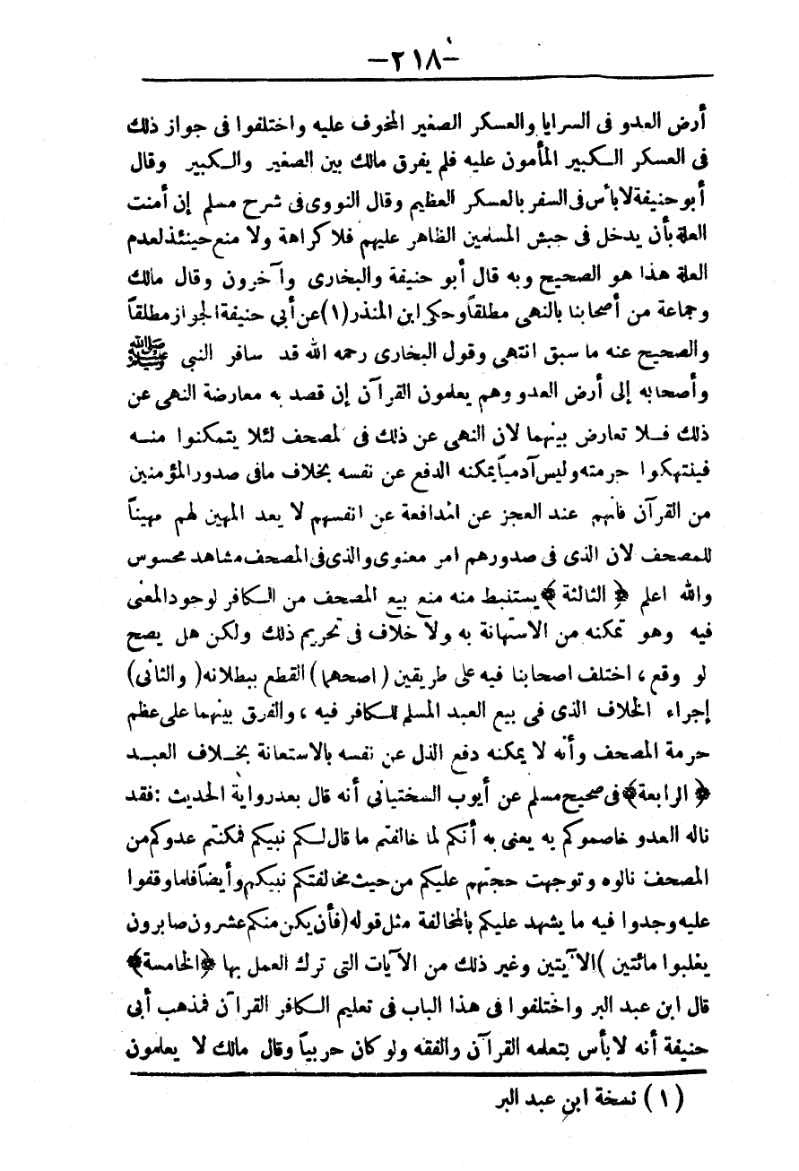 ـــــــــــــــــــــــــــــQأَرْضِ الْعَدُوِّ فِي السَّرَايَا وَالْعَسْكَرِ الصَّغِيرِ الْمَخُوفِ عَلَيْهِ، وَاخْتَلَفُوا فِي جَوَازِ ذَلِكَ فِي الْعَسْكَرِ الْكَبِيرِ الْمَأْمُونِ عَلَيْهِ فَلَمْ يُفَرِّقْ مَالِكٌ بَيْنَ الصَّغِيرِ وَالْكَبِيرِ، وَقَالَ أَبُو حَنِيفَةَ لَا بَأْسَ فِي السَّفَرِ بِالْعَسْكَرِ الْعَظِيمِ، وَقَالَ النَّوَوِيُّ فِي شَرْحِ مُسْلِمٍ إنْ أُمِنَتْ الْعِلَّةُ بِأَنْ يَدْخُلَ فِي جَيْشِ الْمُسْلِمِينَ الظَّاهِرُ عَلَيْهِمْ فَلَا كَرَاهَةَ، وَلَا مَنْعَ حِينَئِذٍ لِعَدَمِ الْعِلَّةِ هَذَا هُوَ الصَّحِيحُ، وَبِهِ قَالَ أَبُو حَنِيفَةَ وَالْبُخَارِيُّ، وَآخَرُونَ، وَقَالَ مَالِكٌ، وَجَمَاعَةٌ مِنْ أَصْحَابِنَا بِالنَّهْيِ مُطْلَقًا، وَحَكَى ابْنُ الْمُنْذِرِ عَنْ أَبِي حَنِيفَةَ الْجَوَازَ مُطْلَقًا، وَالصَّحِيحُ عَنْهُ مَا سَبَقَ انْتَهَى، وَقَوْلُ الْبُخَارِيِّ - رَحِمَهُ اللَّهُ - قَدْ سَافَرَ النَّبِيُّ - صَلَّى اللَّهُ عَلَيْهِ وَسَلَّمَ - وَأَصْحَابُهُ إلَى أَرْضِ الْعَدُوِّ، وَهُمْ يَعْلَمُونَ الْقُرْآنَ إنْ قَصَدَ بِهِ مُعَارَضَةَ النَّهْيِ عَنْ ذَلِكَ فَلَا تَعَارُضَ بَيْنَهُمَا لِأَنَّ النَّهْيَ عَنْ ذَلِكَ فِي الْمُصْحَفِ لِئَلَّا يَتَمَكَّنُوا مِنْهُ فَيَنْتَهِكُوا حُرْمَتَهُ، وَلَيْسَ آدَمِيًّا يُمْكِنُهُ الدَّفْعُ عَنْ نَفْسِهِ بِخِلَافِ مَا فِي صُدُورِ الْمُؤْمِنِينَ مِنْ الْقُرْآنِ فَإِنَّهُمْ عِنْدَ الْعَجْزِ عَنْ الْمُدَافَعَةِ عَنْ أَنْفُسِهِمْ لَا يُعَدُّ الْمُهِينُ لَهُمْ مُهِينًا لِلْمُصْحَفِ لِأَنَّ الَّذِي فِي صُدُورِهِمْ أَمْرٌ مَعْنَوِيٌّ، وَاَلَّذِي فِي الْمُصْحَفِ مُشَاهَدٌ مَحْسُوسٌ، وَاَللَّهُ أَعْلَمُ.
