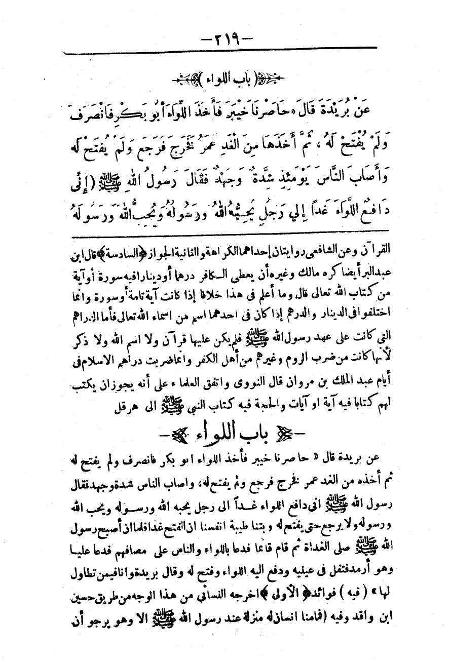 عَنْ بُرَيْدَةَ قَالَ «حَاصَرْنَا خَيْبَرَ فَأَخَذَ اللِّوَاءَ أَبُو بَكْرٍ فَانْصَرَفَ، وَلَمْ يُفْتَحْ لَهُ ثُمَّ أَخَذَهُ مِنْ الْغَدِ عُمَرُ فَخَرَجَ فَرَجَعَ وَلَمْ يُفْتَحْ لَهُ وَأَصَابَ النَّاسَ شِدَّةٌ، وَجَهْدٌ فَقَالَ رَسُولُ اللَّهِ - صَلَّى اللَّهُ عَلَيْهِ وَسَلَّمَ - إنِّي دَافِعٌ اللِّوَاءَ غَدًا إلَى رَجُلٍ يُحِبُّهُ اللَّهُ وَرَسُولُهُ وَيُحِبُّ اللَّهَ وَرَسُولَهُ وَلَا يَرْجِعُ حَتَّى يُفْتَحَ لَهُ وَبِتْنَا طَيِّبَةً أَنْفُسُنَا أَنَّ الْفَتْحَ غَدًا فَلَمَّا أَنْ أَصْبَحَ رَسُولُ اللَّهِ - صَلَّى اللَّهُ عَلَيْهِ وَسَلَّمَ - صَلَّى الْغَدَاةَ ثُمَّ قَامَ قَائِمًا فَدَعَا بِاللِّوَاءِ، وَالنَّاسُ عَلَى مَصَافِّهِمْ فَدَعَا عَلِيًّا، وَهُوَ أَرْمَدُ فَتَفَلَ فِي عَيْنَيْهِ، وَدَفَعَ إلَيْهِ اللِّوَاءَ، وَفُتِحَ لَهُ، وَقَالَ بُرَيْدَةَ، وَأَنَا فِيمَنْ تَطَاوَلَ لَهَا» . (فِيهِ) فَوَائِدُ: