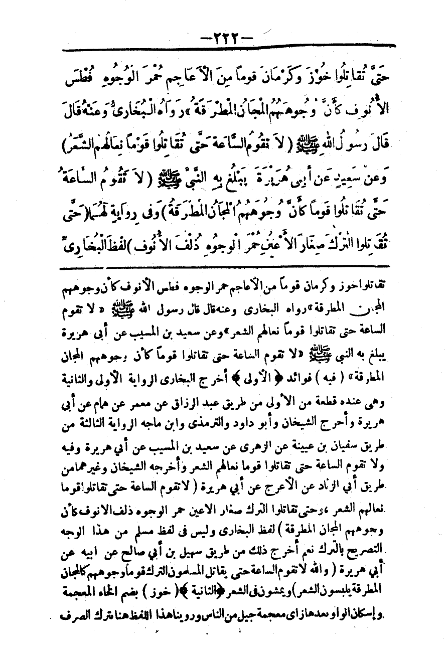 حَتَّى تُقَاتِلُوا خُوزَ وَكَرْمَانَ قَوْمًا مِنْ الْأَعَاجِمِ حُمْرَ الْوُجُوهِ فُطْسَ الْأُنُوفِ كَأَنَّ وُجُوهَهُمْ الْمَجَانُّ الْمُطْرَقَةُ» رَوَاهُ الْبُخَارِيُّ، وَعَنْهُ قَالَ قَالَ رَسُولُ اللَّهِ - صَلَّى اللَّهُ عَلَيْهِ وَسَلَّمَ - «لَا تَقُومُ السَّاعَةُ حَتَّى تُقَاتِلُوا قَوْمًا نِعَالُهُمْ الشَّعَرُ» وَعَنْ سَعِيدٍ عَنْ أَبِي هُرَيْرَةَ يَبْلُغُ بِهِ النَّبِيَّ - صَلَّى اللَّهُ عَلَيْهِ وَسَلَّمَ - «لَا تَقُومُ السَّاعَةُ حَتَّى تُقَاتِلُوا قَوْمًا كَأَنَّ وُجُوهَهُمْ الْمَجَانُّ الْمُطْرَقَةُ» ، وَفِي رِوَايَةٍ لَهُمَا «حَتَّى تُقَاتِلُوا التُّرْكَ صِغَارَ الْأَعْيُنِ حُمْرَ الْوُجُوهِ ذُلْفَ الْأُنُوفِ» لَفْظُ الْبُخَارِيِّ.