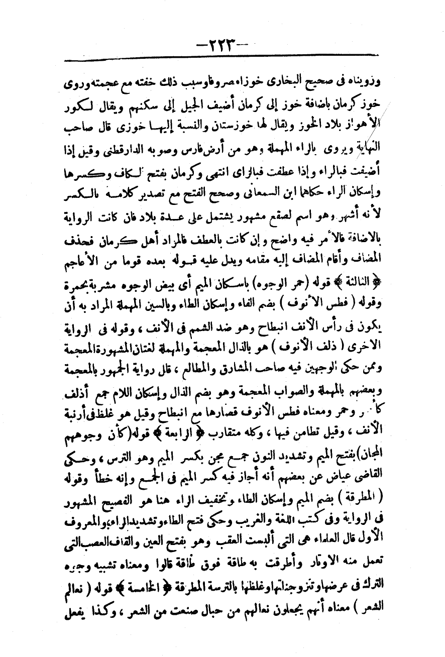 ـــــــــــــــــــــــــــــQوَرَوَيْنَاهُ فِي صَحِيحِ الْبُخَارِيِّ خَوْزًا مَصْرُوفًا، وَسَبَبُ ذَلِكَ خِفَّتُهُ مَعَ عُجْمَتِهِ، وَرَوَى خُوزَ كَرْمَانَ بِإِضَافَةِ خَوْزٍ إلَى كَرْمَانَ أُضِيفَ الْجِيلُ إلَى سَكَنِهِمْ، وَيُقَالُ لِكُورِ الْأَهْوَازِ بِلَادَ الْخَوْزِ، وَيُقَالُ لَهَا خُوزِسْتَانَ، وَالنِّسْبَةُ إلَيْهَا خُوزِيٌّ قَالَ صَاحِبُ النِّهَايَةِ، وَيُرْوَى بِالرَّاءِ الْمُهْمَلَةِ، وَهُوَ مِنْ أَرْضِ فَارِسٍ، وَصَوَّبَهُ الدَّارَقُطْنِيُّ، وَقِيلَ إذَا أُضِيفَتْ فَبِالرَّاءِ، وَإِذَا عُطِفَتْ فَبِالزَّايِ انْتَهَى وَكَرْمَانُ بِفَتْحِ الْكَافِ وَكَسْرِهَا وَإِسْكَانِ الرَّاءِ حَكَاهُمَا ابْنُ السَّمْعَانِيِّ، وَصَحَّحَ الْفَتْحَ مَعَ تَصْدِيرِ كَلَامِهِ بِالْكَسْرِ لِأَنَّهُ أَشْهَرُ، وَهُوَ اسْمٌ لِصَقْعٍ مَشْهُورٍ يَشْتَمِلُ عَلَى عِدَّةِ بِلَادٍ فَإِنْ كَانَتْ الرِّوَايَةُ بِالْإِضَافَةِ فَالْأَمْرُ فِيهِ وَاضِحٌ، وَإِنْ كَانَتْ بِالْعَطْفِ فَالْمُرَادُ أَهْلُ كَرْمَانَ فَحَذَفَ الْمُضَافَ، وَأَقَامَ الْمُضَافَ إلَيْهِ مَقَامَهُ، وَيَدُلُّ عَلَيْهِ قَوْلُهُ بَعْدَهُ قَوْمًا مِنْ الْأَعَاجِمِ.