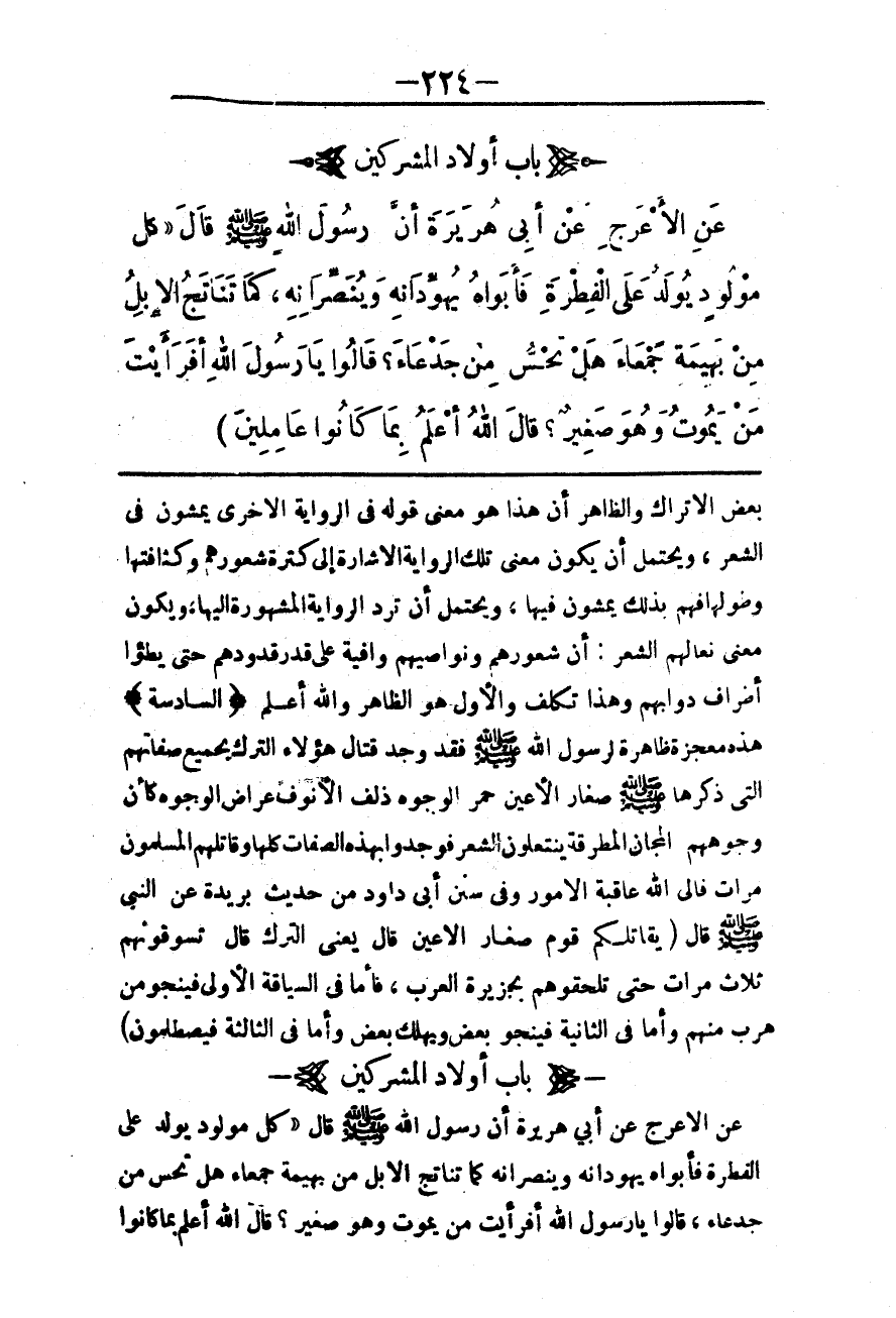 عَنْ الْأَعْرَجِ عَنْ أَبِي هُرَيْرَةَ أَنَّ رَسُولَ اللَّهِ - صَلَّى اللَّهُ عَلَيْهِ وَسَلَّمَ - قَالَ «كُلُّ مَوْلُودٍ يُولَدُ عَلَى الْفِطْرَةِ فَأَبَوَاهُ يُهَوِّدَانِهِ وَيُنَصِّرَانِهِ كَمَا تَنَاتَجُ الْإِبِلُ مِنْ بَهِيمَةٍ جَمْعَاءَ هَلْ تُحِسُّ مِنْ جَدْعَاءَ، قَالُوا: يَا رَسُولَ اللَّهِ أَفَرَأَيْت مَنْ يَمُوتُ وَهُوَ صَغِيرٌ؟ قَالَ اللَّهُ أَعْلَمُ بِمَا كَانُوا