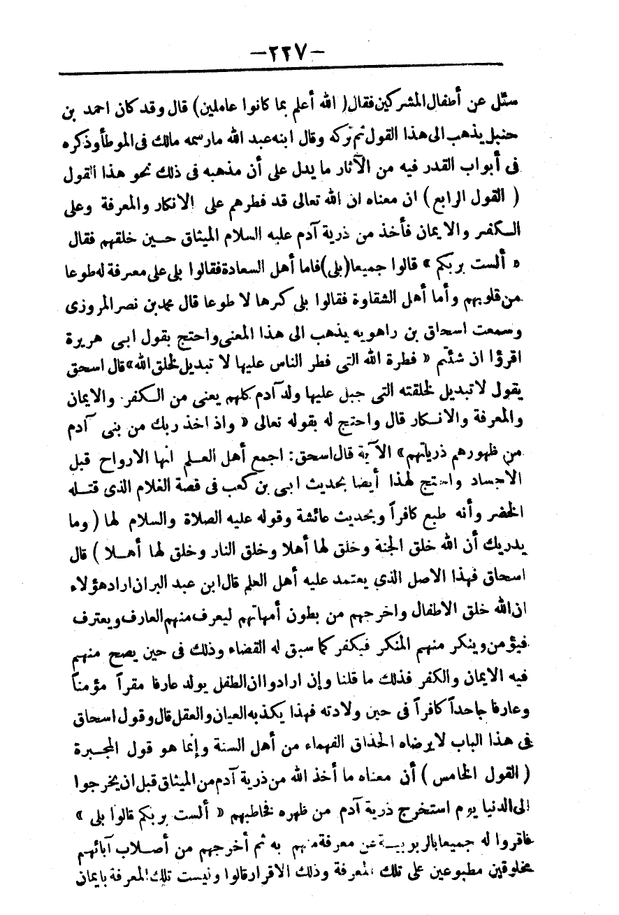 قَالَ إِسْحَاقُ فَهَذَا الْأَصْلُ الَّذِي يَعْتَمِدُ عَلَيْهِ أَهْلُ الْعِلْمِ قَالَ ابْنُ عَبْدِ الْبَرِّ إنْ أَرَادَ هَؤُلَاءِ أَنَّ اللَّهَ خَلَقَ الْأَطْفَالَ، وَأَخْرَجَهُمْ مِنْ بُطُونِ أُمَّهَاتِهِمْ لِيَعْرِفَ مِنْهُمْ الْعَارِفُ وَيَعْتَرِفَ فَيُؤْمِنُ، وَيُنْكِرَ مِنْهُمْ الْمُنْكَرُ فَيَكْفُرَ كَمَا سَبَقَ لَهُ الْقَضَاءُ، وَذَلِكَ فِي حِينٍ يَصِحُّ مِنْهُمْ فِيهِ الْإِيمَانُ، وَالْكُفْرُ فَذَلِكَ مَا قُلْنَا، وَإِنْ أَرَادُوا أَنَّ الطِّفْلَ يُولَدُ عَارِفًا مُقِرًّا مُؤْمِنًا وَعَارِفًا جَاحِدًا كَافِرًا فِي حِينِ وِلَادَتِهِ فَهَذَا يُكَذِّبُهُ الْعِيَانُ وَالْعَقْلُ قَالَ، وَقَوْلُ إِسْحَاقَ فِي هَذَا الْبَابِ لَا يَرْضَاهُ الْحُذَّاقُ الْفُهَمَاءُ مِنْ أَهْلِ السُّنَّةِ.