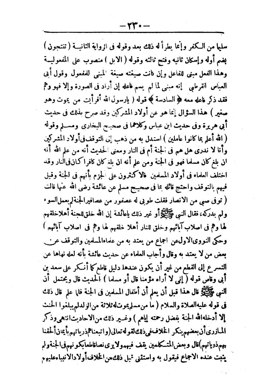 وَذَكَرَ الْمَازِرِيُّ أَنَّ بَعْضَهُمْ يُنْكِرُ الْخِلَافَ فِي ذَلِكَ لِقَوْلِهِ تَعَالَى {وَاتَّبَعَتْهُمْ ذُرِّيَّتُهُمْ بِإِيمَانٍ أَلْحَقْنَا بِهِمْ ذُرِّيَّتَهُمْ} [الطور: 21] قَالَ وَبَعْضُ الْمُتَكَلِّمِينَ يَقِفُ فِيهِمْ، وَلَا يَرَى نَصًّا قَاطِعًا بِكَوْنِهِمْ فِي الْجَنَّةِ، وَلَمْ يَثْبُتْ عِنْدَهُ الْإِجْمَاعُ فَيَقُولُ بِهِ، وَاسْتَثْنَى قَبْلَ ذَلِكَ مِنْ الْخِلَافِ أَوْلَادَ الْأَنْبِيَاءٍ - عَلَيْهِمْ السَّلَامُ -
