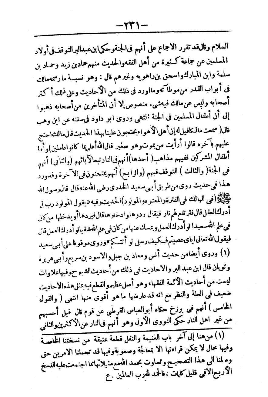 ـــــــــــــــــــــــــــــQوَقَالَ قَدْ تَقَرَّرَ الْإِجْمَاعُ عَلَى أَنَّهُمْ فِي الْجَنَّةِ، وَحَكَى ابْنُ عَبْدِ الْبَرِّ التَّوَقُّفَ فِي أَوْلَادِ الْمُسْلِمِينَ عَنْ جَمَاعَةٍ كَثِيرَةٍ مِنْ أَهْلِ الْفِقْهِ، وَالْحَدِيثِ مِنْهُمْ حَمَّادُ بْنُ زَيْدٍ، وَحَمَّادُ بْنُ سَلَمَةَ، وَابْنُ الْمُبَارَكِ، وَإِسْحَاقُ بْنُ رَاهْوَيْهِ، وَغَيْرُهُمْ.