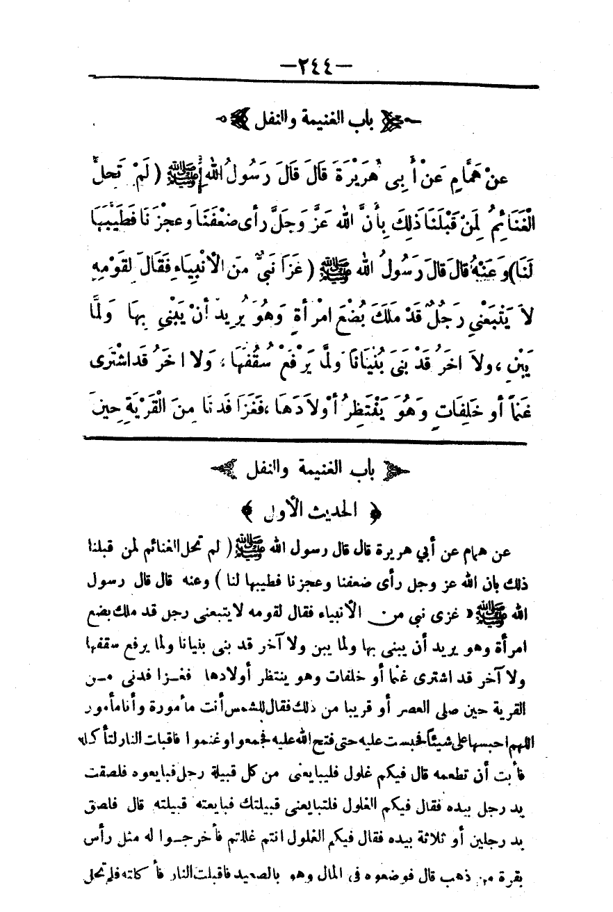 هَمَّامٍ عَنْ أَبِي هُرَيْرَةَ قَالَ قَالَ رَسُولُ اللَّهِ - صَلَّى اللَّهُ عَلَيْهِ وَسَلَّمَ - «لَمْ تَحِلَّ الْغَنَائِمُ لِمَنْ قَبْلَنَا ذَلِكَ بِأَنَّ اللَّهَ عَزَّ وَجَلَّ رَأَى ضَعْفَنَا وَعَجْزَنَا فَطَيَّبَهَا لَنَا» ، وَعَنْهُ قَالَ قَالَ رَسُولُ اللَّهِ - صَلَّى اللَّهُ عَلَيْهِ وَسَلَّمَ - «غَزَا نَبِيٌّ مِنْ الْأَنْبِيَاءِ فَقَالَ لِقَوْمِهِ لَا يَتْبَعْنِي رَجُلٌ قَدْ مَلَكَ بُضْعَ امْرَأَةٍ، وَهُوَ يُرِيدُ أَنْ يَبْنِيَ بِهَا، وَلَمَّا يَبْنِ وَلَا آخَرُ قَدْ بَنَى بُنْيَانًا، وَلَمَّا يَرْفَعْ سَقْفَهَا، وَلَا آخَرُ قَدْ اشْتَرَى غَنَمًا أَوْ خَلِفَاتٍ، وَهُوَ يَنْتَظِرُ أَوْلَادَهَا فَغَزَا فَدَنَا مِنْ الْقَرْيَةِ حِينَ صَلَّى الْعَصْرَ أَوْ قَرِيبًا مِنْ ذَلِكَ فَقَالَ لِلشَّمْسِ أَنْتِ مَأْمُورَةٌ، وَأَنَا مَأْمُورٌ اللَّهُمَّ احْبِسْهَا عَلَيَّ شَيْئًا فَحُبِسَتْ عَلَيْهِ حَتَّى فَتَحَ اللَّهُ عَلَيْهِ فَجَمَعُوا وَغَنِمُوا فَأَقْبَلَتْ النَّارُ لِتَأْكُلَهُ فَأَبَتْ أَنْ تَطْعَمَهُ قَالَ فِيكُمْ غُلُولٌ فَلْيُبَايِعْنِي مِنْ كُلِّ قَبِيلَةٍ رَجُلٌ فَبَايَعُوهُ فَلَصِقَتْ يَدُ رَجُلٍ بِيَدِهِ فَقَالَ فِيكُمْ الْغُلُولُ فَلْتُبَايِعْنِي قَبِيلَتُك فَبَايَعَتْهُ قَبِيلَتُهُ قَالَ فَلَصِقَ يَدُ رَجُلَيْنِ أَوْ ثَلَاثَةٍ بِيَدِهِ فَقَالَ فِيكُمْ الْغُلُولُ أَنْتُمْ غَلَلْتُمْ فَأَخْرَجُوا لَهُ مِثْلَ رَأْسِ بَقَرَةٍ مِنْ ذَهَبٍ قَالَ فَوَضَعُوهُ فِي الْمَالِ وَهُوَ بِالصَّعِيدِ فَأَقْبَلَتْ النَّارُ فَأَكَلَتْهُ فَلَمْ تَحِلَّ