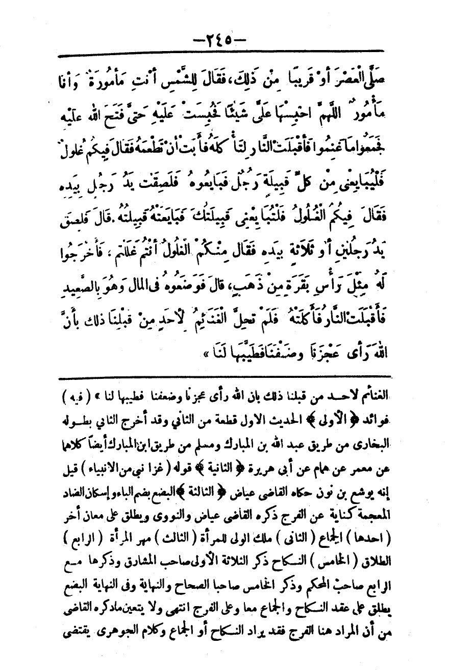 صَلَّى الْعَصْرَ أَوْ قَرِيبًا مِنْ ذَلِكَ، فَقَالَ لِلشَّمْسِ أَنْتِ مَأْمُورَةٌ، وَأَنَا مَأْمُورٌ اللَّهُمَّ احْتَبِسْهَا عَلَيَّ شَيْئًا فَحُبِسَتْ عَلَيْهِ حَتَّى فَتَحَ اللَّهُ عَلَيْهِ فَجَمَعُوا مَا غَنِمُوا فَأَقْبَلَتْ النَّارُ لِتَأْكُلَهُ فَأَبَتْ أَنْ تَطْعَمَهُ فَقَالَ فِيكُمْ غُلُولٌ فَلْيُبَايِعْنِي مِنْ كُلِّ قَبِيلَةٍ رَجُلٌ فَبَايَعُوهُ فَلَصِقَتْ يَدُ رَجُلٍ بِيَدِهِ فَقَالَ فِيكُمْ الْغُلُولُ فَلْتُبَايِعْنِي قَبِيلَتُك فَبَايَعَتْهُ قَبِيلَتُهُ. قَالَ فَلَصِقَ يَدُ رَجُلَيْنِ أَوْ ثَلَاثَةٍ بِيَدِهِ فَقَالَ مِنْكُمْ الْغُلُولُ أَنْتُمْ غَلَلْتُمْ. فَأَخْرَجُوا لَهُ مِثْلَ رَأْسِ بَقَرَةٍ مِنْ ذَهَبٍ، قَالَ فَوَضَعُوهُ فِي الْمَالِ، وَهُوَ بِالصَّعِيدِ فَأَقْبَلَتْ النَّارُ فَأَكَلَتْهُ فَلَمْ تَحِلَّ الْغَنَائِمُ لِأَحَدٍ مِنْ قَبْلِنَا ذَلِكَ بِأَنَّ اللَّهَ رَأَى عَجْزَنَا وَضَعْفَنَا فَطَيَّبَهَا لَنَا» .