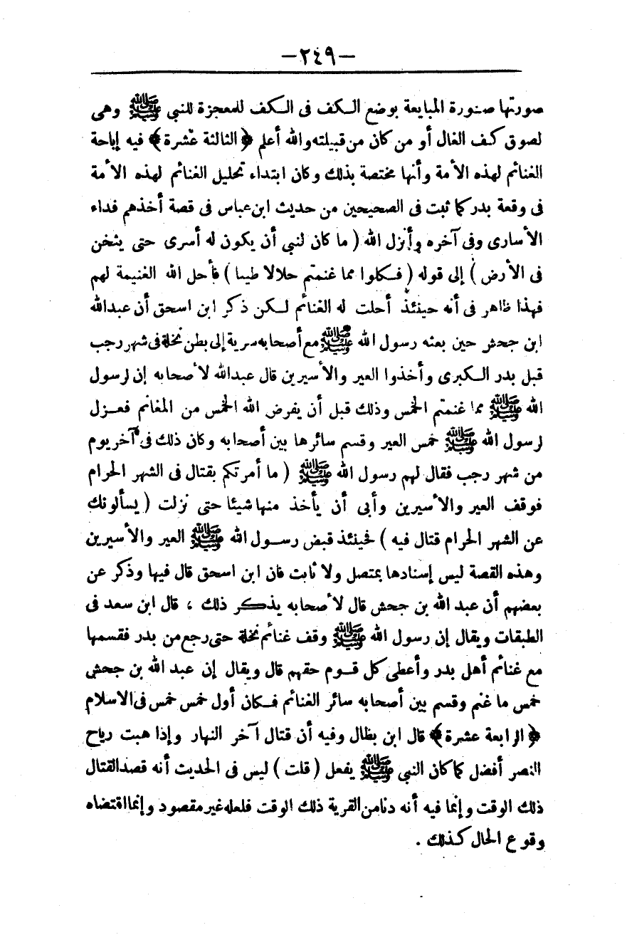 {الثَّالِثَةَ عَشْرَةَ} فِيهِ إبَاحَةُ الْغَنَائِمِ لِهَذِهِ الْأَمَةِ، وَأَنَّهَا مُخْتَصَّةٌ بِذَلِكَ، وَكَانَ ابْتِدَاءُ تَحْلِيلِ الْغَنَائِمِ لِهَذِهِ الْأَمَةِ فِي وَقْعَةِ بَدْرٍ كَمَا ثَبَتَ فِي الصَّحِيحَيْنِ مِنْ حَدِيثِ ابْنِ عَبَّاسٍ فِي قِصَّةِ أَخْذِهِمْ فِدَاءَ الْأُسَارَى وَفِي آخِرِهِ، وَأَنْزَلَ اللَّهُ {مَا كَانَ لِنَبِيٍّ أَنْ يَكُونَ لَهُ أَسْرَى حَتَّى يُثْخِنَ فِي الأَرْضِ} [الأنفال: 67] إلَى قَوْلِهِ {فَكُلُوا مِمَّا غَنِمْتُمْ حَلالا طَيِّبًا} [الأنفال: 69] فَأَحَلَّ اللَّهُ الْغَنِيمَةَ لَهُمْ فَهَذَا ظَاهِرٌ فِي أَنَّهُ حِينَئِذٍ أُحِلَّتْ لَهُ الْغَنَائِمُ لَكِنْ ذَكَرَ ابْنُ إِسْحَاقَ «أَنَّ عَبْدَ اللَّهِ بْنَ جَحْشٍ حِينَ بَعَثَهُ رَسُولُ اللَّهِ - صَلَّى اللَّهُ عَلَيْهِ وَسَلَّمَ - مَعَ أَصْحَابِهِ سَرِيَّةً إلَى بَطْنِ نَخْلَةٍ فِي شَهْرِ رَجَبٍ قَبْلَ بَدْرٍ الْكُبْرَى، وَأَخَذُوا الْعِيرَ وَالْأَسِيرِينَ قَالَ عَبْدُ اللَّهِ لِأَصْحَابِهِ إنَّ لِرَسُولِ اللَّهِ - صَلَّى اللَّهُ عَلَيْهِ وَسَلَّمَ - مِمَّا غَنِمْتُمْ الْخُمُسَ، وَذَلِكَ قَبْلَ أَنْ يَفْرِضَ اللَّهُ الْخُمُسَ مِنْ الْمَغَانِمِ فَعَزَلَ لِرَسُولِ اللَّهِ - صَلَّى اللَّهُ عَلَيْهِ وَسَلَّمَ - خُمُسَ الْعِيرِ، وَقَسَمَ سَائِرَهَا بَيْنَ أَصْحَابِهِ، وَكَانَ ذَلِكَ فِي آخَرِ يَوْمٍ مِنْ شَهْرِ رَجَبٍ فَقَالَ لَهُمْ رَسُولُ اللَّهِ - صَلَّى اللَّهُ عَلَيْهِ وَسَلَّمَ - مَا أَمَرْتُكُمْ بِقِتَالٍ فِي الشَّهْرِ الْحَرَامِ فَوَقَفَ الْعِيرَ وَالْأَسِيرِينَ، وَأَبَى أَنْ يَأْخُذَ مِنْهَا شَيْئًا حَتَّى نَزَلَتْ {يَسْأَلُونَكَ عَنِ الشَّهْرِ الْحَرَامِ قِتَالٍ فِيهِ} [البقرة: 217] فَحِينَئِذٍ قَبَضَ رَسُولُ اللَّهِ - صَلَّى اللَّهُ عَلَيْهِ وَسَلَّمَ - الْعِيرَ وَالْأَسِيرِينَ» ، وَهَذِهِ الْقِصَّةُ لَيْسَ إسْنَادُهَا بِمُتَّصِلٍ وَلَا ثَابِتٍ فَإِنَّ ابْنَ إِسْحَاقَ قَالَ فِيهَا، وَذُكِرَ عَنْ بَعْضِهِمْ أَنَّ عَبْدَ اللَّهِ بْنَ جَحْشٍ قَالَ لِأَصْحَابِهِ يَذْكُرُ ذَلِكَ، قَالَ ابْنُ سَعْدٍ فِي الطَّبَقَاتِ: وَيُقَالُ «إنَّ رَسُولَ اللَّهِ - صَلَّى اللَّهُ عَلَيْهِ وَسَلَّمَ - وَقَفَ غَنَائِمَ نَخْلَةَ حَتَّى رَجَعَ مِنْ بَدْرٍ فَقَسَمَهَا مَعَ غَنَائِمِ أَهْلِ بَدْرٍ، وَأَعْطَى كُلَّ قَوْمٍ حَقَّهُمْ» قَالَ: وَيُقَالُ إنَّ عَبْدَ اللَّهِ بْنَ جَحْشٍ خَمَّسَ مَا غَنِمَ وَقَسَمَ بَيْنَ أَصْحَابِهِ سَائِرَ الْغَنَائِمِ فَكَانَ أَوَّلَ خُمُسٍ خُمِّسَ فِي الْإِسْلَامِ.