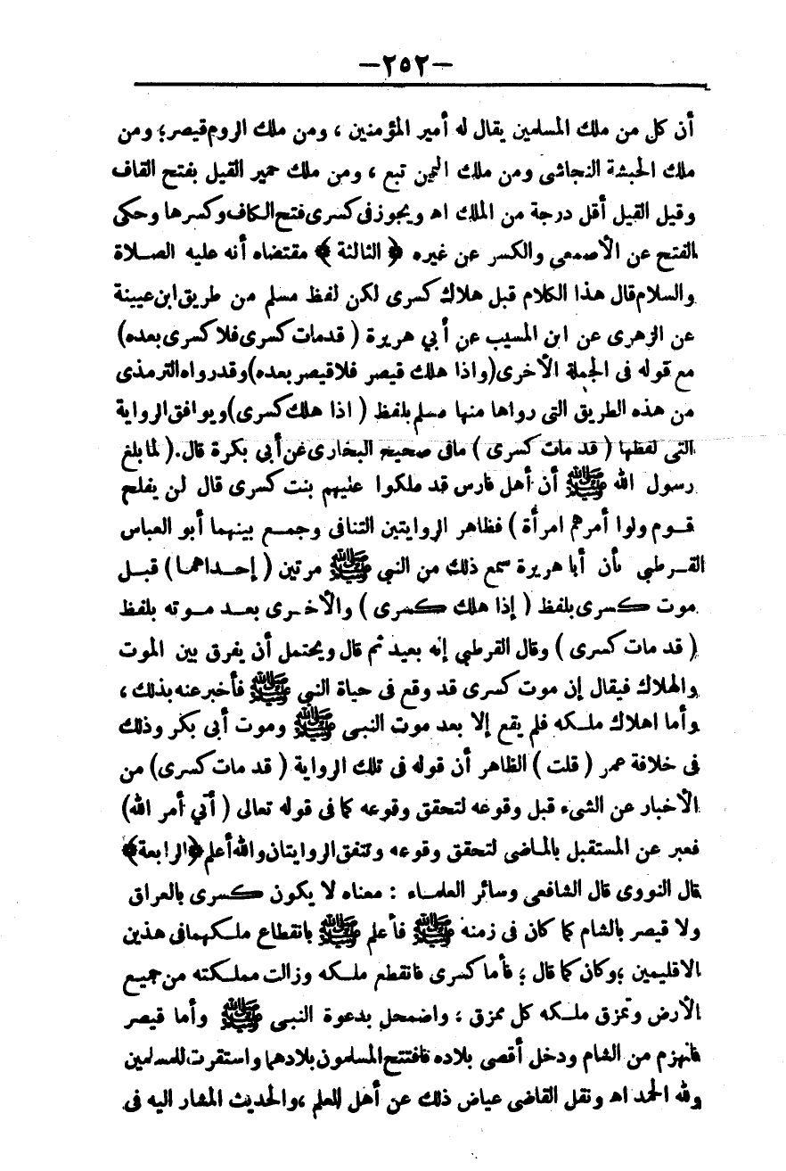وَيُوَافِقُ الرِّوَايَةَ الَّتِي لَفْظُهَا «قَدْ مَاتَ كِسْرَى» مَا فِي صَحِيحِ الْبُخَارِيِّ عَنْ أَبِي بَكْرَةَ قَالَ. «لَمَّا بَلَغَ رَسُولَ اللَّهِ - صَلَّى اللَّهُ عَلَيْهِ وَسَلَّمَ - أَنَّ أَهْلِ فَارِسَ قَدْ مَلَّكُوا عَلَيْهِمْ بِنْتَ كِسْرَى قَالَ لَنْ يُفْلِحَ قَوْمٌ وَلَّوْا أَمْرَهُمْ امْرَأَةً» فَظَاهِرُ الرِّوَايَتَيْنِ التَّنَافِي، وَجَمَعَ بَيْنَهُمَا أَبُو الْعَبَّاسِ الْقُرْطُبِيُّ بِأَنَّ أَبَا هُرَيْرَةَ سَمِعَ ذَلِكَ مِنْ النَّبِيِّ - صَلَّى اللَّهُ عَلَيْهِ وَسَلَّمَ - مَرَّتَيْنِ (إحْدَاهُمَا) قَبْلَ مَوْتِ كِسْرَى بِلَفْظِ «إذَا هَلَكَ كِسْرَى» وَالْأُخْرَى بَعْدَ مَوْتِهِ بِلَفْظِ «قَدْ مَاتَ كِسْرَى» .