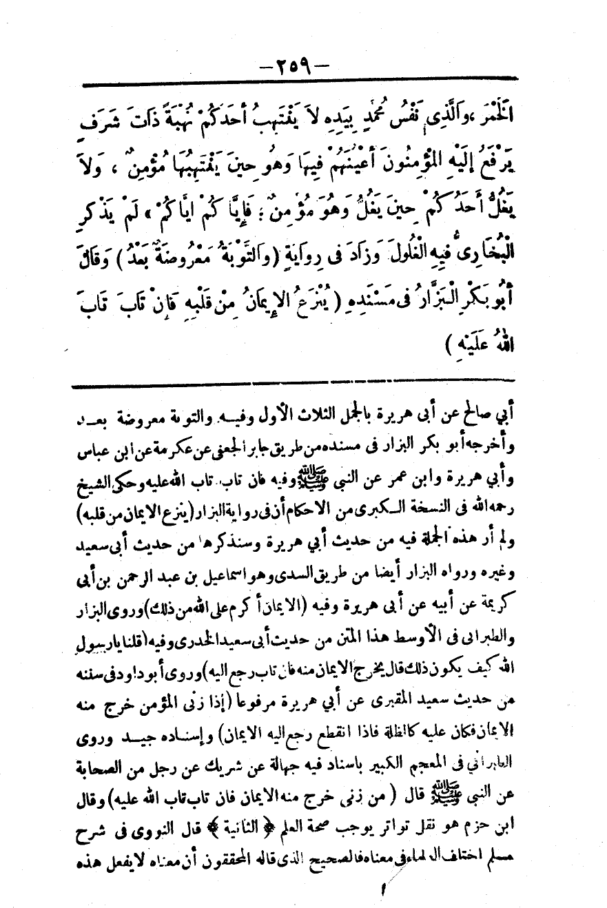الْخَمْرَ، وَاَلَّذِي نَفْسُ مُحَمَّدٍ بِيَدِهِ لَا يَنْتَهِبُ أَحَدُكُمْ نُهْبَةً ذَاتَ شَرَفٍ يَرْفَعُ إلَيْهِ الْمُؤْمِنُونَ أَعْيُنَهُمْ فِيهَا، وَهُوَ حِينَ يَنْتَهِبُهَا مُؤْمِنٌ، وَلَا يَغُلُّ أَحَدُكُمْ حِينَ يَغُلُّ، وَهُوَ مُؤْمِنٌ فَإِيَّاكُمْ إيَّاكُمْ» لَمْ يَذْكُرْ الْبُخَارِيُّ فِيهِ الْغُلُولَ، وَزَادَ فِي رِوَايَةٍ «وَالتَّوْبَةُ مَعْرُوضَةٌ بَعْدُ» وَقَالَ أَبُو بَكْرٍ الْبَزَّارُ فِي مُسْنَدِهِ «يُنْزَعُ الْإِيمَانُ مِنْ قَلْبِهِ فَإِنْ تَابَ تَابَ اللَّهُ عَلَيْهِ» ..