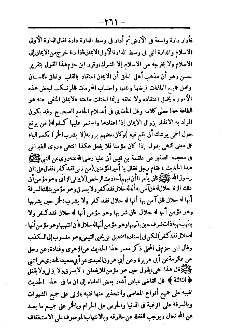 ـــــــــــــــــــــــــــــQفَأَدَارَ دَارَةً وَاسِعَةً فِي الْأَرْضِ ثُمَّ أَدَارَ فِي وَسَطِ الدَّارَةِ دَارَةً فَقَالَ الدَّارَةُ الْأُولَى الْإِسْلَامُ، وَالدَّارَةُ الَّتِي فِي وَسَطِ الدَّارَةِ الْأُولَى الْإِيمَانُ فَإِذَا زَنَا خَرَجَ مِنْ الْإِيمَانِ إلَى الْإِسْلَامِ، وَلَا يُخْرِجُهُ مِنْ الْإِسْلَامِ إلَّا الشِّرْكُ، وَقَرَّرَ ابْنُ حَزْمٍ هَذَا الْقَوْلَ بِتَقْرِيرٍ حَسَنٍ، وَهُوَ أَنَّ مَذْهَبَ أَهْلِ الْحَقِّ أَنَّ الْإِيمَانَ اعْتِقَادٌ بِالْقَلْبِ وَنُطْقٌ بِاللِّسَانِ، وَعَمَلُ جَمِيعِ الطَّاعَاتِ فَرْضِهَا وَنَفْلِهَا، وَاجْتِنَابُ الْمُحَرَّمَاتِ فَالْمُرْتَكِبُ لِبَعْضِ هَذِهِ الْأُمُورِ لَمْ يَخْتَلَّ اعْتِقَادُهُ وَلَا نُطْقُهُ، وَإِنَّمَا اخْتَلَّتْ طَاعَتُهُ فَالْإِيمَانُ الْمَنْفِيُّ عَنْهُ هُوَ الطَّاعَةُ هَذَا مَعْنَى كَلَامِهِ.