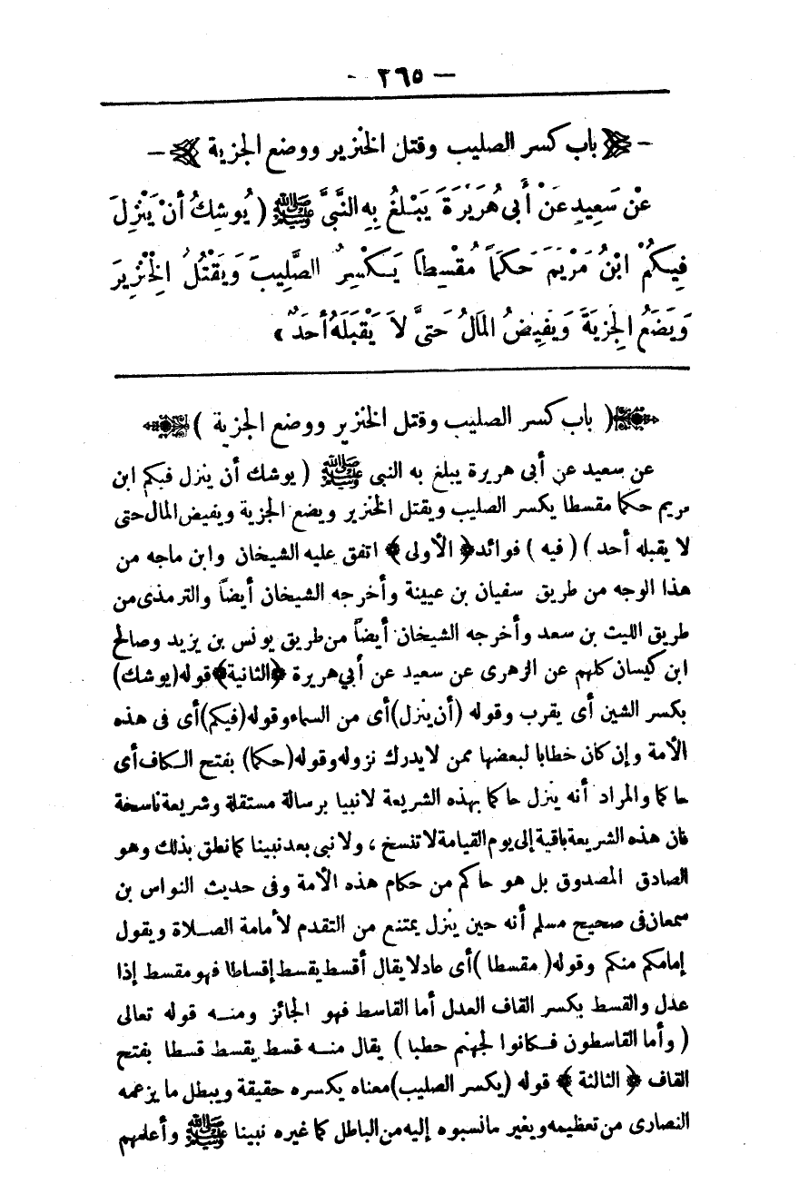 عَنْ سَعِيدٍ عَنْ أَبِي هُرَيْرَةَ يَبْلُغُ بِهِ النَّبِيَّ - صَلَّى اللَّهُ عَلَيْهِ وَسَلَّمَ - «يُوشِكُ أَنْ يَنْزِلَ فِيكُمْ ابْنُ مَرْيَمَ حَكَمًا مُقْسِطًا يَكْسِرُ الصَّلِيبَ وَيَقْتُلُ الْخِنْزِيرَ وَيَضَعُ الْجِزْيَةَ وَيَفِيضُ الْمَالُ حَتَّى لَا يَقْبَلَهُ أَحَدٌ» .