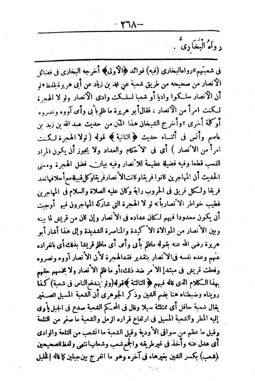 (فِيهِ) فَوَائِدٌ {الْأُولَى} أَخْرَجَهُ الْبُخَارِيُّ فِي فَضَائِلِ الْأَنْصَارِ مِنْ صَحِيحِهِ مِنْ طَرِيقِ شُعْبَةَ عَنْ مُحَمَّدِ بْنِ زِيَادٍ عَنْ أَبِي هُرَيْرَةَ بِلَفْظِ «لَوْ أَنَّ الْأَنْصَارَ سَلَكُوا وَادِيًا أَوْ شَعْبًا لَسَلَكْت وَادِيَ الْأَنْصَارِ وَلَوْلَا الْهِجْرَةُ لَكُنْت امْرَأً مِنْ الْأَنْصَارِ فَقَالَ أَبُو هُرَيْرَةَ مَا ظُلْمٌ بِأَبِي وَأُمِّي آوَوْهُ وَنَصَرُوهُ أَوْ كَلِمَةٌ أُخْرَى» وَأَخْرَجَ الشَّيْخَانِ هَذَا الْمَتْنَ مِنْ حَدِيثِ عَبْدِ اللَّهِ بْنِ زَيْدِ بْنِ عَاصِمٍ وَأَنَسٍ فِي أَثْنَاءِ حَدِيثِ. {الثَّانِيَةُ} قَوْلُهُ «لَوْلَا الْهِجْرَةُ لَكُنْت امْرَأً مِنْ الْأَنْصَارِ»