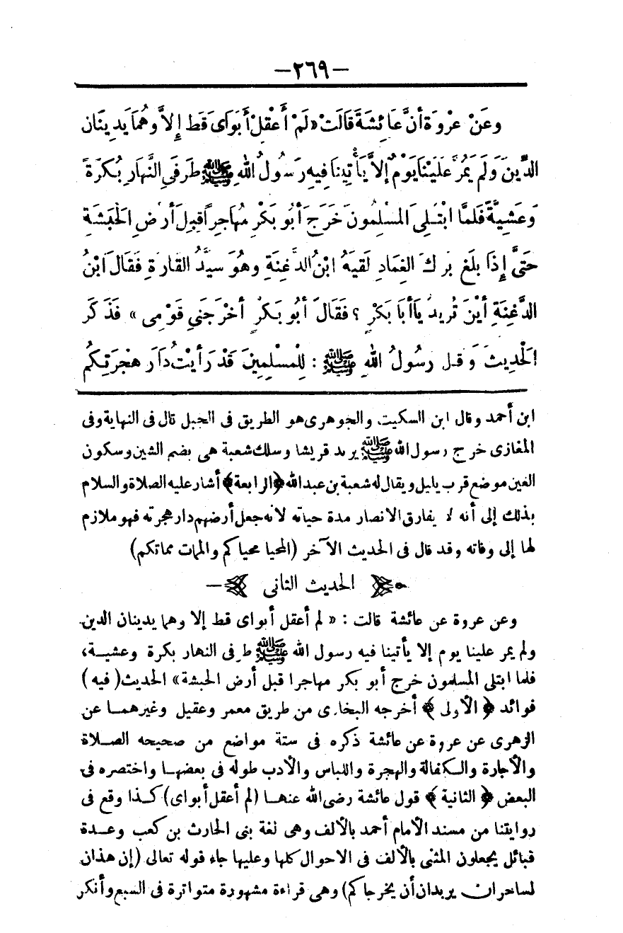وَعَنْ عُرْوَةَ عَنْ «عَائِشَةَ قَالَتْ: لَمْ أَعْقِلْ أَبَوَايَ قَطُّ إلَّا وَهُمَا يَدِينَانِ الدِّينَ، وَلَمْ يَمُرَّ عَلَيْنَا يَوْمٌ إلَّا يَأْتِينَا فِيهِ رَسُولُ اللَّهِ - صَلَّى اللَّهُ عَلَيْهِ وَسَلَّمَ - طَرَفَيْ النَّهَارِ بُكْرَةً وَعَشِيَّةً، فَلَمَّا اُبْتُلِيَ الْمُسْلِمُونَ خَرَجَ أَبُو بَكْرٍ مُهَاجِرًا قِبَلَ أَرْضِ الْحَبَشَةِ» الْحَدِيثُ (فِيهِ) فَوَائِدٌ {الْأُولَى} أَخْرَجَهُ الْبُخَارِيُّ مِنْ طَرِيقِ مَعْمَرٍ، وَعُقَيْلٍ، وَغَيْرِهِمَا عَنْ الزُّهْرِيِّ عَنْ عُرْوَةَ عَنْ عَائِشَةَ ذَكَرَهُ فِي سِتَّةِ مَوَاضِعَ مِنْ صَحِيحِهِ الصَّلَاةُ، وَالْإِجَارَةُ، وَالْكَفَالَةُ، وَالْهِجْرَةُ، وَاللِّبَاسُ، وَالْأَدَبُ طُولُهُ فِي بَعْضِهَا، وَاخْتَصَرَهُ فِي الْبَعْضِ. {الثَّانِيَةُ} قَوْلُ عَائِشَةَ - رَضِيَ اللَّهُ عَنْهَا - «لَمْ أَعْقِلْ أَبَوَايَ» كَذَا وَقَعَ فِي رِوَايَتِنَا مِنْ مُسْنَدِ الْإِمَامِ أَحْمَدَ بِالْأَلِفِ وَهِيَ لُغَةُ بَنِي الْحَارِثِ بْنِ كَعْبٍ وَعِدَّةِ قَبَائِلَ يَجْعَلُونَ الْمُثَنَّى بِالْأَلِفِ فِي الْأَحْوَالِ كُلِّهَا، وَعَلَيْهَا جَاءَ قَوْله تَعَالَى {إِنْ هَذَانِ لَسَاحِرَانِ يُرِيدَانِ أَنْ يُخْرِجَاكُمْ} [طه: 63] ، وَهِيَ قِرَاءَةٌ مَشْهُورَةٌ مُتَوَاتِرَةٌ فِي السَّبْعِ، وَأَنْكَرَ