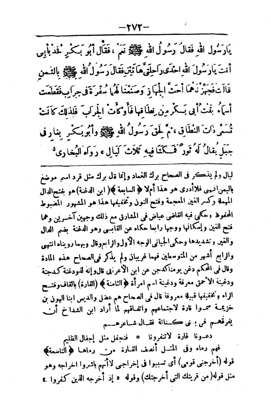 يَا رَسُولَ اللَّهِ فَقَالَ رَسُولُ اللَّهِ - صَلَّى اللَّهُ عَلَيْهِ وَسَلَّمَ - نَعَمْ، فَقَالَ أَبُو بَكْرٍ فَخُذْ بِأَبِي أَنْتَ يَا رَسُولَ اللَّهِ إحْدَى رَاحِلَتَيَّ هَاتَيْنِ فَقَالَ رَسُولُ اللَّهِ - صَلَّى اللَّهُ عَلَيْهِ وَسَلَّمَ - بِالثَّمَنِ قَالَتْ فَجَهَّزْنَاهُمَا أَحَثَّ الْجِهَازِ وَصَنَعْنَا لَهُمَا سُفْرَةً فِي جِرَابٍ فَقَطَعَتْ أَسْمَاءُ بِنْتُ أَبِي بَكْرٍ مِنْ نِطَاقِهَا فَأَوْكَأَتْ الْجِرَابَ فَلِذَلِكَ كَانَتْ تُسَمَّى ذَاتَ النِّطَاقِ، ثُمَّ لَحِقَ رَسُولُ اللَّهِ - صَلَّى اللَّهُ عَلَيْهِ وَسَلَّمَ -، وَأَبُو بَكْرٍ بِغَارٍ فِي جَبَلٍ يُقَالُ لَهُ ثَوْرٌ فَمَكَثَا فِيهِ ثَلَاثَ لَيَالٍ» رَوَاهُ الْبُخَارِيُّ..