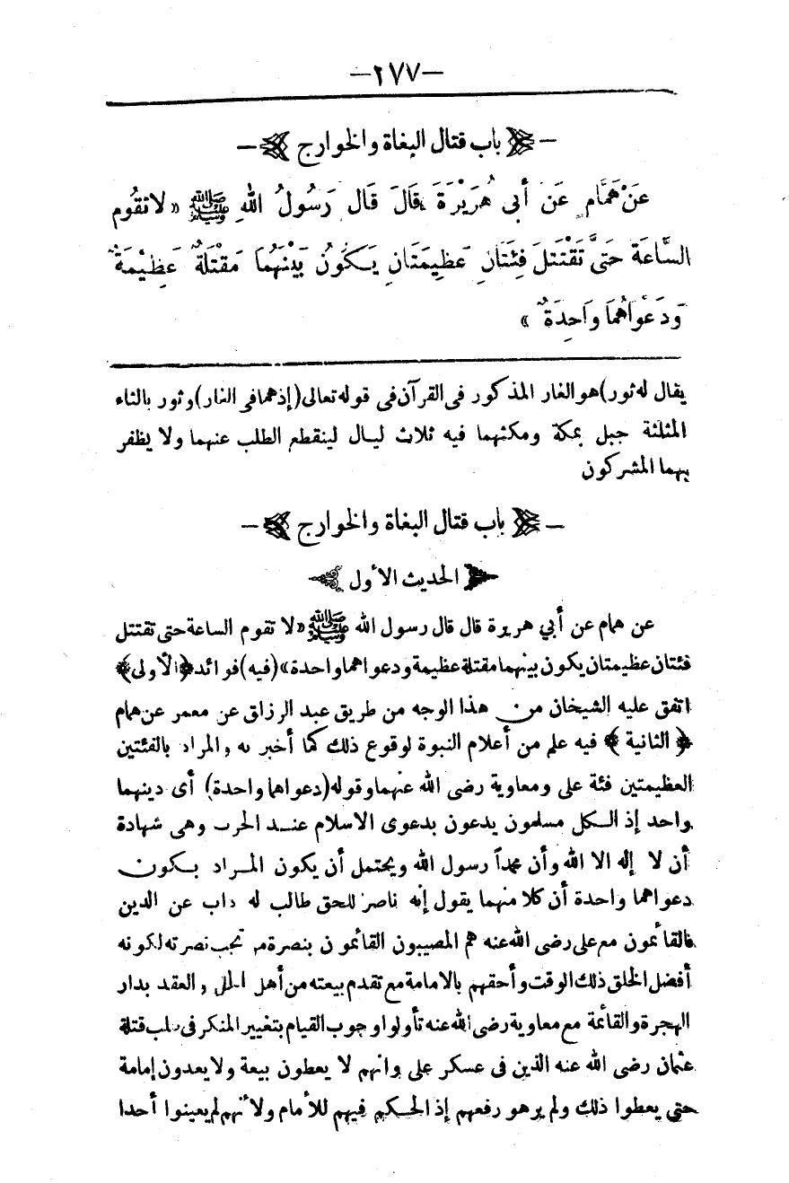 بَابُ قِتَالِ الْبُغَاةِ وَالْخَوَارِجِ عَنْ هَمَّامٍ عَنْ أَبِي هُرَيْرَةَ قَالَ قَالَ رَسُولُ اللَّهِ - صَلَّى اللَّهُ عَلَيْهِ وَسَلَّمَ - «لَا تَقُومُ السَّاعَةُ حَتَّى تَقْتَتِلَ فِئَتَانِ عَظِيمَتَانِ يَكُونُ بَيْنَهُمَا مَقْتَلَةٌ عَظِيمَةٌ وَدَعْوَاهُمَا وَاحِدَةٌ» .