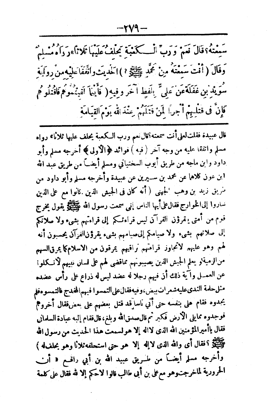 سَمِعْته؟ قَالَ نَعَمْ، وَرَبِّ الْكَعْبَةِ يَحْلِفُ عَلَيْهَا ثَلَاثًا» رَوَاهُ مُسْلِمٌ «، وَقَالَ أَنْتَ سَمِعْته مِنْ مُحَمَّدٍ - صَلَّى اللَّهُ عَلَيْهِ وَسَلَّمَ -» الْحَدِيثَ، وَاتَّفَقَا عَلَيْهِ مِنْ رِوَايَةِ سُوَيْد بْنِ غَفَلَةَ عَنْ عَلِيٍّ بِلَفْظٍ آخَرَ، وَفِيهِ «فَأَيْنَمَا لَقِيتُمُوهُمْ فَاقْتُلُوهُمْ فَإِنَّ فِي قَتْلِهِمْ أَجْرًا لِمَنْ قَتَلَهُمْ عِنْدَ اللَّهِ يَوْمَ الْقِيَامَةِ» .