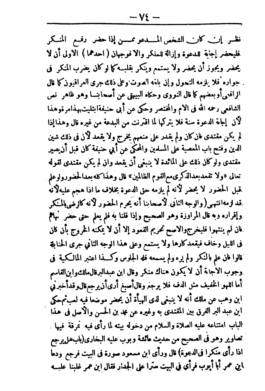 وَقَالَ ابْنُ عَبْدِ الْبَرِّ قَالَ مَالِكٌ وَابْنُ الْقَاسِمِ أَمَّا اللَّهْوُ الْخَفِيفُ مِثْلُ الدُّفِّ فَلَا يَرْجِعُ، وَقَالَ أَصْبَغُ أَرَى أَنْ يَرْجِعَ قَالَ، وَقَدْ أَخْبَرَنِي ابْنُ وَهْبٍ عَنْ مَالِكٍ أَنَّهُ لَا يَنْبَغِي لِذِي الْهَيْئَةِ أَنْ يَحْضُرَ مَوْضِعًا فِيهِ لَعِبٌ ثُمَّ حَكَى ابْنُ عَبْدِ الْبَرِّ الْفَرْقَ بَيْنَ الْمُقْتَدَى بِهِ وَغَيْرِهِ عَنْ مُحَمَّدِ بْنِ الْحَسَنِ، وَالْأَصْلُ فِي هَذَا الْبَابِ امْتِنَاعُهُ - عَلَيْهِ الصَّلَاةُ وَالسَّلَامُ - مِنْ دُخُولِهِ بَيْتَهُ لَمَّا رَأَى فِيهِ نُمْرُقَةً فِيهَا تَصَاوِيرُ، وَهُوَ فِي الصَّحِيحِ مِنْ حَدِيثِ عَائِشَةَ، وَبَوَّبَ عَلَيْهِ الْبُخَارِيُّ (بَابُ هَلْ يَرْجِعُ إذَا رَأَى مُنْكَرًا فِي الدَّعْوَةِ) قَالَ، وَرَأَى ابْنُ مَسْعُودٍ صُورَةً فِي الْبَيْتِ فَرَجَعَ.