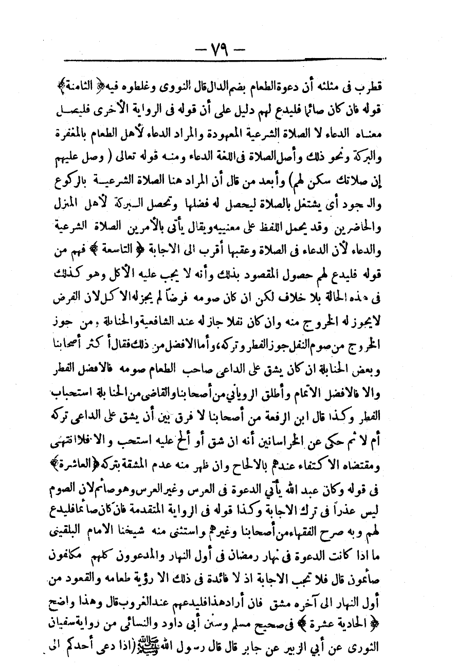 (التَّاسِعَةُ) فُهِمَ مِنْ قَوْلِهِ فَلْيَدْعُ لَهُمْ حُصُولُ الْمَقْصُودِ بِذَلِكَ، وَأَنَّهُ لَا يَجِبُ عَلَيْهِ الْأَكْلُ، وَهُوَ كَذَلِكَ فِي هَذِهِ الْحَالَةِ بِلَا خِلَافٍ لَكِنْ إنْ كَانَ صَوْمُهُ فَرْضًا لَمْ يَجُزْ لَهُ الْأَكْلُ لِأَنَّ الْفَرْضَ لَا يَجُوزُ لَهُ الْخُرُوجُ مِنْهُ، وَإِنْ كَانَ نَفْلًا جَازَ لَهُ عِنْدَ الشَّافِعِيَّةِ وَالْحَنَابِلَةِ، وَمَنْ جَوَّزَ الْخُرُوجَ مِنْ صَوْمِ النَّفْلِ جَوَّزَ الْفِطْرَ وَتَرْكَهُ، وَأَمَّا الْأَفْضَلُ مِنْ ذَلِكَ فَقَالَ أَكْثَرُ أَصْحَابِنَا، وَبَعْضُ الْحَنَابِلَةِ إنْ كَانَ يَشُقُّ عَلَى الدَّاعِي صَاحِبِ الطَّعَامِ صَوْمُهُ فَالْأَفْضَلُ الْفِطْرُ، وَإِلَّا فَالْأَفْضَلُ الْإِتْمَامُ، وَأَطْلَقَ الرُّويَانِيُّ مِنْ أَصْحَابِنَا وَالْقَاضِي مِنْ الْحَنَابِلَةِ اسْتِحْبَابَ الْفِطْرِ، وَكَذَا قَالَ ابْنُ الرِّفْعَةِ مِنْ أَصْحَابِنَا لَا فَرْقَ بَيْنَ أَنْ يَشُقَّ عَلَى الدَّاعِي تَرْكُهُ أَمْ لَا ثُمَّ حَكَى عَنْ الْخُرَاسَانِيِّينَ أَنَّهُ إنْ شَقَّ أَوْ أُلِحَّ عَلَيْهِ اُسْتُحِبَّ، وَإِلَّا فَلَا انْتَهَى.
