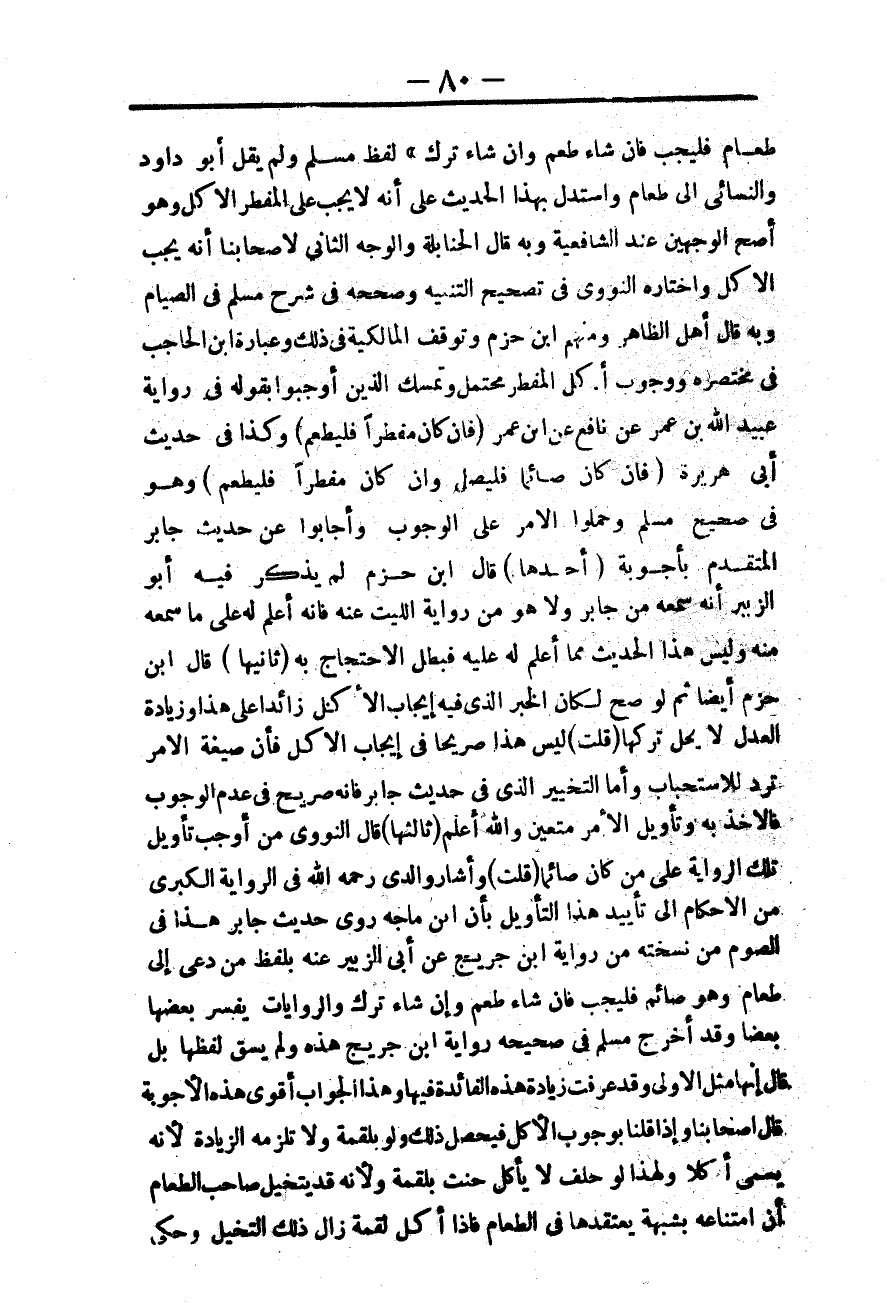 وَاسْتُدِلَّ بِهَذَا الْحَدِيثِ عَلَى أَنَّهُ لَا يَجِبُ عَلَى الْمُفْطِرِ الْأَكْلُ، وَهُوَ أَصَحُّ الْوَجْهَيْنِ عِنْدَ الشَّافِعِيَّةِ، وَبِهِ قَالَ الْحَنَابِلَةُ، وَالْوَجْهُ الثَّانِي لِأَصْحَابِنَا أَنَّهُ يَجِبُ الْأَكْلُ، وَاخْتَارَهُ النَّوَوِيُّ فِي تَصْحِيحِ التَّنْبِيهِ، وَصَحَّحَهُ فِي شَرْحِ مُسْلِمٍ فِي الصِّيَامِ، وَبِهِ قَالَ أَهْلُ الظَّاهِرِ، وَمِنْهُمْ ابْنُ حَزْمٍ، وَتَوَقَّفَ الْمَالِكِيَّةُ فِي ذَلِكَ، وَعِبَارَةُ ابْنِ الْحَاجِبِ فِي مُخْتَصَرِهِ، وَوُجُوبُ أَكْلِ الْمُفْطِرِ مُحْتَمَلٌ، وَتَمَسَّكَ الَّذِينَ أَوْجَبُوا بِقَوْلِهِ فِي رِوَايَةِ عُبَيْدِ اللَّهِ بْنِ عُمَرَ عَنْ نَافِعٍ عَنْ ابْنِ عُمَرَ «فَإِنْ كَانَ مُفْطِرًا فَلْيَطْعَمْ» . وَكَذَا فِي حَدِيثِ أَبِي هُرَيْرَةَ «فَإِنْ كَانَ صَائِمًا فَلْيُصَلِّ، وَإِنْ كَانَ مُفْطِرًا فَلْيَطْعَمْ» ، وَهُوَ فِي صَحِيحِ مُسْلِمٍ، وَحَمَلُوا الْأَمْرَ عَلَى الْوُجُوبِ، وَأَجَابُوا عَنْ حَدِيثِ جَابِرٍ الْمُتَقَدِّمِ بِأَجْوِبَةٍ (أَحَدُهَا) قَالَ ابْنُ حَزْمٍ لَمْ يَذْكُرْ فِيهِ أَبُو الزُّبَيْرِ أَنَّهُ سَمِعَهُ مِنْ جَابِرٍ، وَلَا هُوَ مِنْ رِوَايَةِ اللَّيْثِ عَنْهُ فَإِنَّهُ أُعْلِمَ لَهُ عَلَى مَا سَمِعَهُ مِنْهُ، وَلَيْسَ هَذَا الْحَدِيثُ مِمَّا أُعْلِمَ لَهُ عَلَيْهِ فَبَطَلَ الِاحْتِجَاجُ بِهِ.