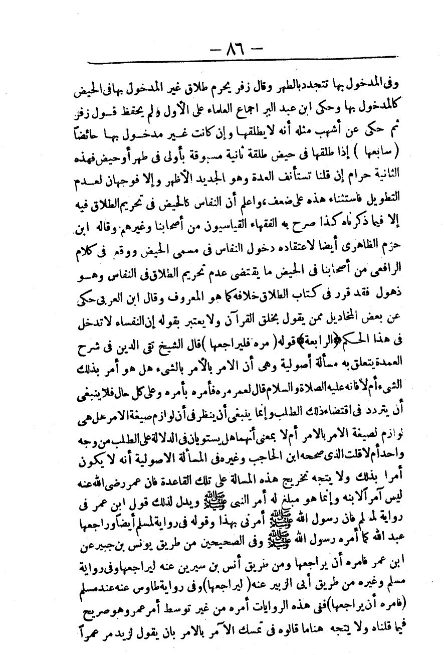 (الرَّابِعَةُ) قَوْلُهُ (مُرْهُ فَلْيُرَاجِعْهَا) قَالَ الشَّيْخُ تَقِيُّ الدِّينِ فِي شَرْحِ الْعُمْدَةِ يَتَعَلَّقُ بِهِ مَسْأَلَةٌ أُصُولِيَّةٌ، وَهِيَ أَنَّ الْأَمْرَ بِالْأَمْرِ بِالشَّيْءِ هَلْ هُوَ أَمْرٌ بِذَلِكَ الشَّيْءِ أَمْ لَا فَإِنَّهُ - عَلَيْهِ الصَّلَاةُ وَالسَّلَامُ - «قَالَ لِعُمَرَ مُرْهُ» فَأَمَرَهُ بِأَمْرِهِ، وَعَلَى كُلِّ حَالٍ فَلَا يَنْبَغِي أَنْ يَتَرَدَّدَ فِي اقْتِضَاءِ ذَلِكَ الطَّلَبِ، وَإِنَّمَا يَنْبَغِي أَنْ يَنْظُرَ فِي أَنَّ لَوَازِمَ صِيغَةِ الْأَمْرِ هَلْ هِيَ لَوَازِمٌ لِصِيغَةِ الْأَمْرِ بِالْأَمْرِ أَمْ لَا بِمَعْنَى أَنَّهُمَا هَلْ يَسْتَوِيَانِ فِي الدَّلَالَةِ عَلَى الطَّلَبِ مِنْ وَجْهٍ وَاحِدٍ أَمْ لَا قُلْت الَّذِي صَحَّحَهُ ابْنُ الْحَاجِبِ وَغَيْرُهُ فِي الْمَسْأَلَةِ الْأُصُولِيَّةِ أَنَّهُ لَا يَكُونُ أَمْرًا بِذَلِكَ، وَلَا يُتَّجَهُ تَخْرِيجُ هَذِهِ الْمَسْأَلَةِ عَلَى تِلْكَ الْقَاعِدَةِ فَإِنَّ عُمَرَ - رَضِيَ اللَّهُ عَنْهُ - لَيْسَ آمِرًا لِابْنِهِ، وَإِنَّمَا هُوَ مُبَلِّغٌ لَهُ أَمْرَ النَّبِيِّ - صَلَّى اللَّهُ عَلَيْهِ وَسَلَّمَ -، وَيَدُلُّ لِذَلِكَ قَوْلُ ابْنِ عُمَرَ فِي رِوَايَةٍ لِمُسْلِمٍ فَإِنَّ رَسُولَ اللَّهِ - صَلَّى اللَّهُ عَلَيْهِ وَسَلَّمَ - أَمَرَنِي بِهَذَا، وَقَوْلُهُ فِي رِوَايَةٍ لِمُسْلِمٍ أَيْضًا، وَرَاجَعَهَا عَبْدُ اللَّهِ كَمَا أَمَرَهُ رَسُولُ اللَّهِ - صَلَّى اللَّهُ عَلَيْهِ وَسَلَّمَ -، وَفِي الصَّحِيحَيْنِ مِنْ طَرِيقِ يُونُسَ بْنِ جُبَيْرٍ عَنْ ابْنِ عُمَرَ فَأَمَرَهُ أَنْ يُرَاجِعَهَا، وَمِنْ طَرِيقِ أَنَسِ بْنِ سِيرِينَ عَنْهُ لِيُرَاجِعْهَا، وَفِي رِوَايَةِ مُسْلِمٍ وَغَيْرِهِ مِنْ طَرِيقِ أَبِي الزُّبَيْرِ عَنْهُ «لِيُرَاجِعْهَا» ، وَفِي رِوَايَةِ طَاوُسٍ عَنْهُ عِنْدَ مُسْلِمٍ «فَأَمَرَهُ أَنْ يُرَاجِعَهَا» فَفِي هَذِهِ الرِّوَايَاتِ أَمْرُهُ مِنْ غَيْرِ تَوَسُّطِ أَمْرِ عُمَرَ، وَهُوَ صَرِيحٌ فِيمَا قُلْنَاهُ، وَلَا يُتَّجَهُ هُنَا مَا قَالُوهُ فِي تَمَسُّكِ الْآمِرِ بِالْأَمْرِ بِأَنْ يَقُولَ لِزَيْدٍ مُرْ عُمْرًا