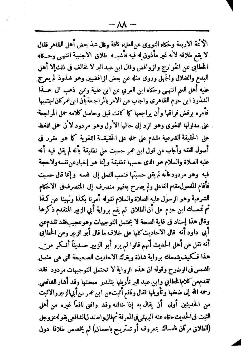 وَحَكَاهُ ابْنُ الْعَرَبِيِّ عَنْ ابْنِ عُلَيَّةَ، وَمِمَّنْ ذَهَبَ إلَى هَذَا الشُّذُوذِ ابْنُ حَزْمٍ الظَّاهِرِيُّ، وَأَجَابَ عَنْ الْأَمْرِ بِالْمُرَاجَعَةِ بِأَنَّ ابْنَ عُمَرَ كَانَ اجْتَنَبَهَا فَأَمَرَهُ بِرَفْضِ فِرَاقِهَا، وَأَنْ يُرَاجِعَهَا كَمَا كَانَتْ قَبْلُ، وَحَاصِلُ كَلَامِهِ حَمْلُ الْمُرَاجَعَةِ عَلَى مَدْلُولِهَا اللُّغَوِيِّ، وَهُوَ الرَّدُّ إلَى حَالِهَا الْأَوَّلِ، وَهُوَ مَرْدُودٌ لِأَنَّ حَمْلَ اللَّفْظِ عَلَى الْحَقِيقَةِ الشَّرْعِيَّةِ مُقَدَّمٌ عَلَى حَمْلِهِ عَلَى الْحَقِيقَةِ اللُّغَوِيَّةِ كَمَا هُوَ مُقَرَّرٌ فِي أُصُولِ الْفِقْهِ، وَأَجَابَ عَنْ قَوْلِ ابْنِ عُمَرَ حُسِبَتْ عَلَيَّ تَطْلِيقَةً بِأَنَّهُ لَمْ يَقُلْ فِيهِ أَنَّهُ - عَلَيْهِ الصَّلَاةُ وَالسَّلَامُ - هُوَ الَّذِي حَسِبَهَا تَطْلِيقَةً، وَإِنَّمَا هُوَ إخْبَارٌ عَنْ نَفْسِهِ، وَلَا حُجَّةَ فِيهِ، وَهُوَ مَرْدُودٌ فَإِنَّهُ لَمْ يَقُلْ حَسِبْتهَا فَنَسَبَ الْفِعْلَ إلَى نَفْسِهِ.