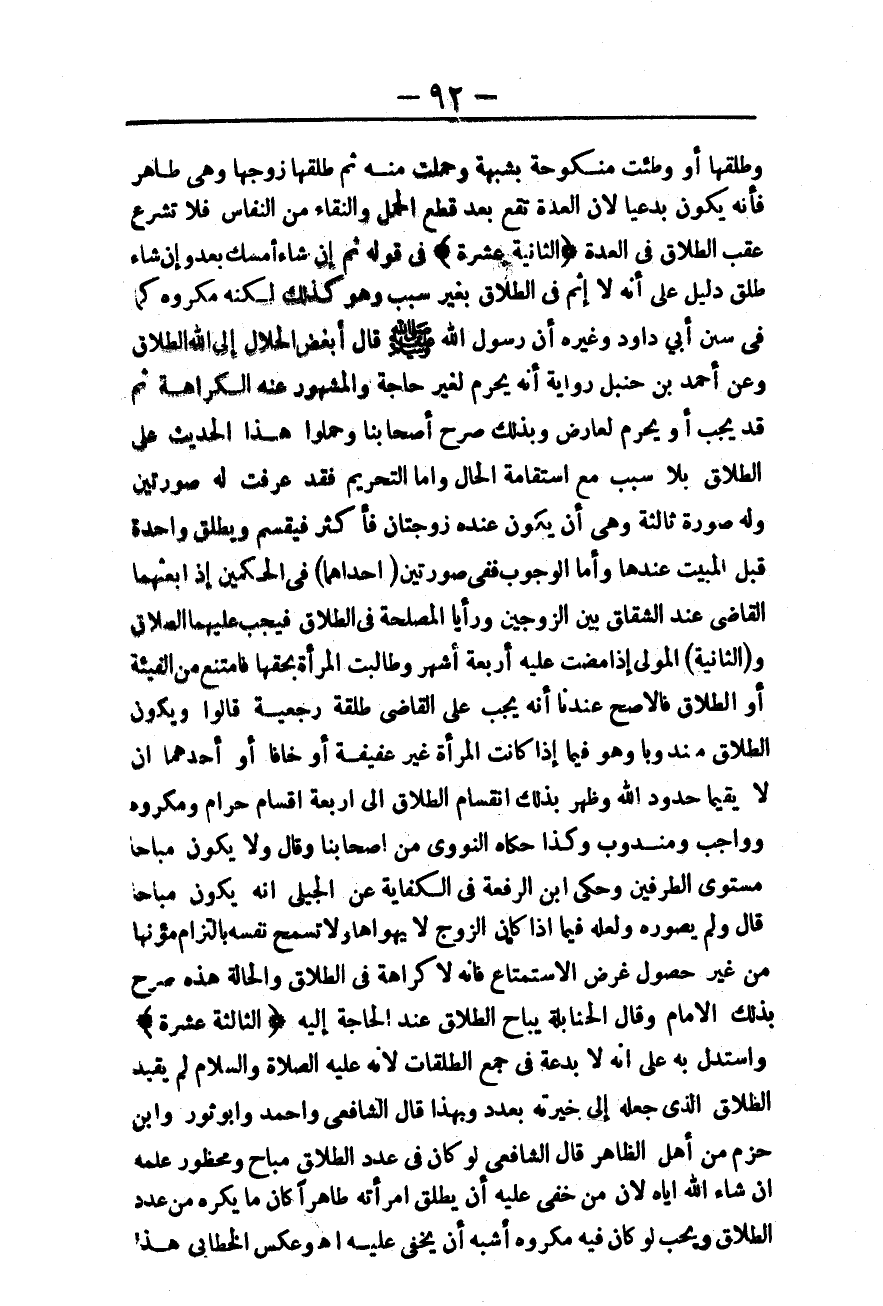 (الثَّانِيَةَ عَشْرَةَ) فِي قَوْلِهِ «ثُمَّ إنْ شَاءَ أَمْسَكَ بَعْدُ، وَإِنْ شَاءَ طَلَّقَ» دَلِيلٌ عَلَى أَنَّهُ لَا إثْمَ فِي الطَّلَاقِ بِغَيْرِ سَبَبٍ، وَهُوَ كَذَلِكَ لَكِنَّهُ مَكْرُوهٌ كَمَا فِي سُنَنِ أَبِي دَاوُد وَغَيْرِهِ أَنَّ رَسُولَ اللَّهِ - صَلَّى اللَّهُ عَلَيْهِ وَسَلَّمَ - قَالَ «أَبْغَضُ الْحَلَالِ إلَى اللَّهِ الطَّلَاقُ» ، وَعَنْ أَحْمَدَ بْنِ حَنْبَلٍ رِوَايَةٌ أَنَّهُ يَحْرُمُ لِغَيْرِ حَاجَةٍ، وَالْمَشْهُورُ عَنْهُ الْكَرَاهَةُ ثُمَّ قَدْ يَجِبُ أَوْ يَحْرُمُ لِعَارِضٍ، وَبِذَلِكَ صَرَّحَ أَصْحَابُنَا، وَحَمَلُوا هَذَا الْحَدِيثَ عَلَى الطَّلَاقِ بِلَا سَبَبٍ مَعَ اسْتِقَامَةِ الْحَالِ، وَأَمَّا التَّحْرِيمُ فَقَدْ عَرَفْت لَهُ صُورَتَيْنِ، وَلَهُ صُورَةٌ ثَالِثَةٌ، وَهِيَ أَنْ يَكُونَ عِنْدَهُ زَوْجَتَانِ فَأَكْثَرُ فَيَقْسِمُ، وَيُطَلِّقُ وَاحِدَةً قَبْلَ الْمَبِيتِ عِنْدَهَا.