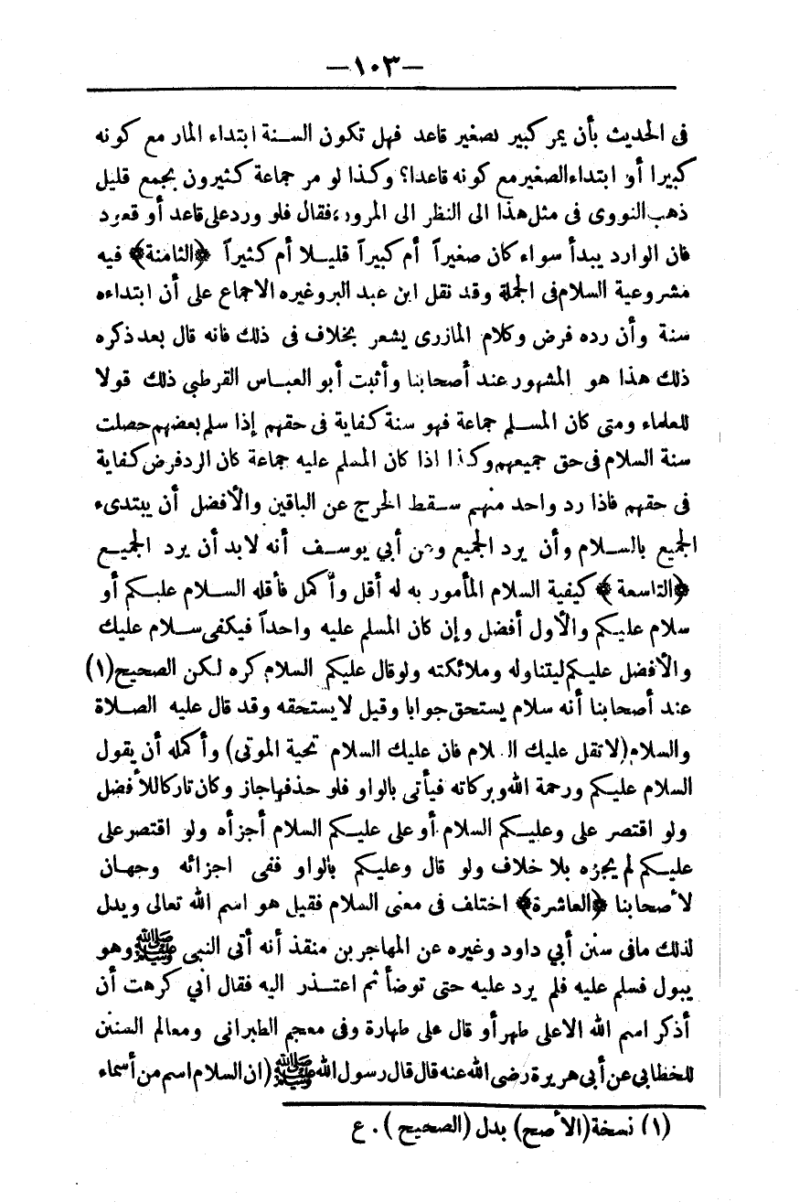 (التَّاسِعَةُ) : كَيْفِيَّةُ السَّلَامِ الْمَأْمُورِ بِهِ لَهُ أَقَلُّ وَأَكْمَلُ فَأَقَلُّهُ السَّلَامُ عَلَيْكُمْ أَوْ سَلَامٌ عَلَيْكُمْ وَالْأَوَّلُ أَفْضَلُ، وَإِنْ كَانَ الْمُسَلَّمُ عَلَيْهِ وَاحِدًا فَيَكْفِي سَلَامٌ عَلَيْك وَالْأَفْضَلُ عَلَيْكُمْ لِيَتَنَاوَلَهُ وَمَلَائِكَتَهُ وَلَوْ قَالَ عَلَيْكُمْ السَّلَامُ كُرِّهَ لَكِنَّ الصَّحِيحَ عِنْدَ أَصْحَابِنَا أَنَّهُ سَلَامٌ يَسْتَحِقُّ جَوَابًا وَقِيلَ لَا يَسْتَحِقُّهُ وَقَدْ قَالَ - عَلَيْهِ الصَّلَاةُ وَالسَّلَامُ - «لَا تَقُلْ عَلَيْك السَّلَامُ فَإِنَّ عَلَيْك تَحِيَّةَ الْمَوْتَى:» وَأَكْمَلُهُ أَنْ يَقُولَ السَّلَامُ عَلَيْكُمْ وَرَحْمَةُ اللَّهِ وَبَرَكَاتُهُ فَيَأْتِي بِالْوَاوِ فَلَوْ حَذَفَهَا جَازَ، وَكَانَ تَارِكًا لِلْأَفْضَلِ وَلَوْ اقْتَصَرَ عَلَى وَعَلَيْكُمْ السَّلَامُ أَوْ عَلَى عَلَيْكُمْ السَّلَامُ أَجْزَأَهُ وَلَوْ اقْتَصَرَ عَلَى عَلَيْكُمْ لَمْ يُجْزِهِ بِلَا خِلَافٍ وَلَوْ قَالَ وَعَلَيْكُمْ بِالْوَاوِ فَفِي إجْزَائِهِ وَجْهَانِ لِأَصْحَابِنَا.
