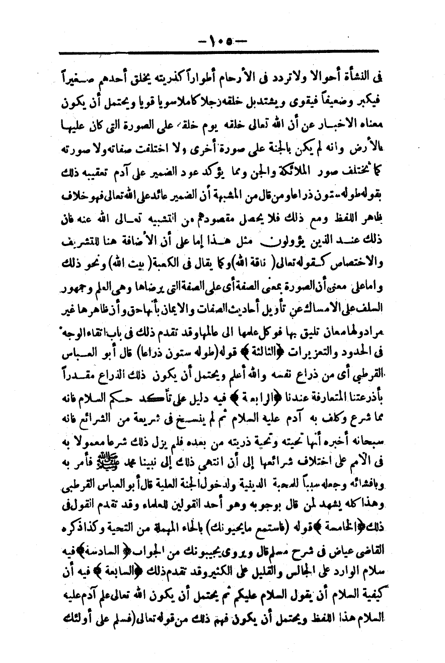 ـــــــــــــــــــــــــــــQفِي النَّشْأَةِ أَحْوَالًا وَلَا تَرَدَّدَ فِي الْأَرْحَامِ أَطْوَارًا كَذُرِّيَّتِهِ يُخْلَقُ أَحَدَهُمْ صَغِيرًا فَيَكْبُرُ وَضَعِيفًا فَيَقْوَى وَيَشْتَدُّ بَلْ خَلَقَهُ رَجُلًا كَامِلًا سَوِيًّا قَوِيًّا وَيُحْتَمَلُ أَنْ يَكُونَ مَعْنَاهُ الْإِخْبَارَ عَنْ أَنَّ اللَّهَ تَعَالَى خَلَقَهُ يَوْمَ خَلَقَهُ عَلَى الصُّورَةِ الَّتِي كَانَ عَلَيْهَا بِالْأَرْضِ وَأَنَّهُ لَمْ يَكُنْ بِالْجَنَّةِ عَلَى صُورَةٍ أُخْرَى وَلَا اخْتَلَفَتْ صِفَاتُهُ وَلَا صُورَتُهُ كَمَا تَخْتَلِفُ صُوَرُ الْمَلَائِكَةِ وَالْجِنِّ وَمِمَّا يُؤَكِّدُ عَوْدَ الضَّمِير عَلَى آدَمَ تَعْقِيبُهُ ذَلِكَ بِقَوْلِهِ طُولُهُ سِتُّونَ ذِرَاعًا وَمَنْ قَالَ مِنْ الْمُشَبِّهَةِ إنَّ الضَّمِيرَ عَائِدٌ عَلَى اللَّهِ تَعَالَى فَهُوَ خِلَافُ ظَاهِرِ اللَّفْظِ وَمَعَ ذَلِكَ فَلَا يَحْصُلُ مَقْصُودُهُمْ مِنْ التَّشْبِيهِ تَعَالَى اللَّهُ عَنْهُ فَإِنَّ ذَلِكَ عِنْدَ الَّذِينَ يُؤَوِّلُونَ مِثْلَ هَذَا إمَّا عَلَى أَنَّ الْإِضَافَةَ هُنَا لِلتَّشْرِيفِ وَالِاخْتِصَاصِ كَقَوْلِهِ تَعَالَى {نَاقَةَ اللَّهِ} [الشمس: 13] وَكَمَا يُقَالُ فِي الْكَعْبَةِ (بَيْتُ اللَّهِ) : وَنَحْوُ ذَلِكَ وَإِمَّا عَلَى مَعْنَى أَنَّ الصُّورَةَ بِمَعْنَى الصِّفَةِ أَيْ عَلَى الصِّفَةِ الَّتِي يَرْضَاهَا وَهِيَ الْعِلْمُ وَجُمْهُورُ السَّلَفِ عَلَى الْإِمْسَاكِ عَنْ تَأْوِيلِ أَحَادِيثِ الصِّفَاتِ وَالْإِيمَانِ بِأَنَّهَا حَقٌّ وَأَنَّ ظَاهِرَهَا غَيْرُ مُرَادٍ وَلَهَا مَعَانٍ تَلِيقُ بِهَا فَوُكِّلَ عِلْمُهَا إلَى عَالِمِهَا وَقَدْ تَقَدَّمَ ذَلِكَ فِي بَابِ اتِّقَاءِ الْوَجْهِ فِي الْحُدُودِ وَالتَّعْزِيرَاتِ.