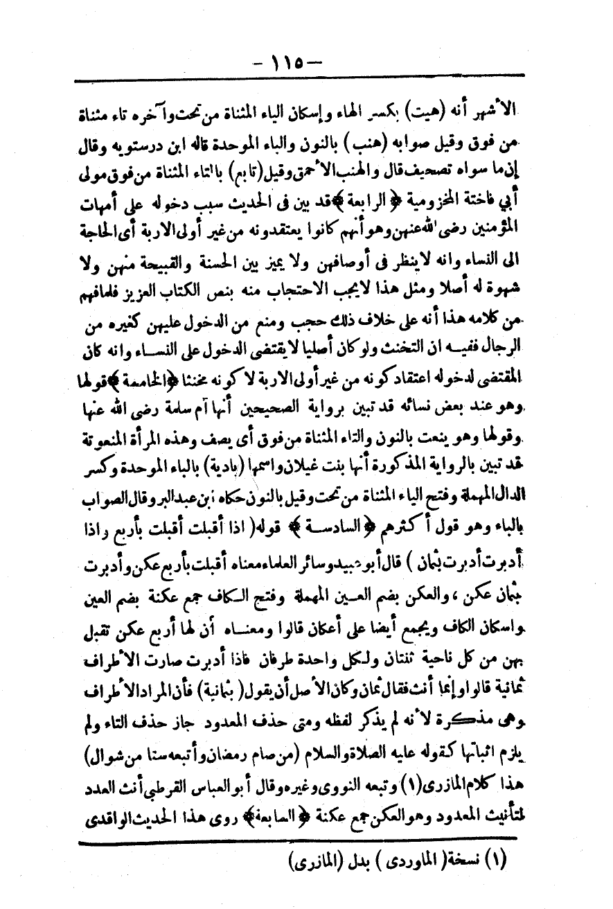 قَالَ أَبُو عُبَيْدٍ وَسَائِرُ الْعُلَمَاءِ مَعْنَاهُ أَقْبَلَتْ بِأَرْبَعٍ عُكَنٍ وَأَدْبَرَتْ بِثَمَانِ عُكَنٍ، وَالْعُكَنُ بِضَمِّ الْعَيْنِ الْمُهْمَلَةِ وَفَتْحِ الْكَافِ جَمْعُ عُكْنَةٍ بِضَمِّ الْعَيْنِ وَإِسْكَانِ الْكَافِ وَيُجْمَعُ أَيْضًا عَلَى أَعْكَانٍ قَالُوا وَمَعْنَاهُ أَنَّ لَهَا أَرْبَعَ عُكَنٍ تُقْبِلُ بِهِنَّ مِنْ كُلِّ نَاحِيَةٍ ثِنْتَانِ وَلِكُلِّ وَاحِدَةٍ طَرَفَانِ فَإِذَا أَدْبَرَتْ صَارَتْ الْأَطْرَافُ ثَمَانِيَةً قَالُوا، وَإِنَّمَا أَنَّثَ فَقَالَ ثَمَانٍ وَكَانَ الْأَصْلُ أَنْ يَقُولَ (بِثَمَانِيَةٍ) : فَإِنَّ الْمُرَادَ الْأَطْرَافُ وَهِيَ مُذَكَّرَةٌ؛ لِأَنَّهُ لَمْ يُذَكَّرْ لَفْظُهُ وَمَتَى حُذِفَ الْمَعْدُودُ جَازَ حَذْفُ التَّاءِ وَلَمْ يَلْزَمْ إثْبَاتُهَا كَقَوْلِهِ - عَلَيْهِ الصَّلَاةُ وَالسَّلَامُ - «مَنْ صَامَ رَمَضَانَ وَأَتْبَعَهُ سِتًّا مِنْ شَوَّالٍ» هَذَا كَلَامُ الْمَازِرِيِّ وَتَبِعَهُ النَّوَوِيُّ وَغَيْرُهُ وَقَالَ أَبُو الْعَبَّاسِ الْقُرْطُبِيُّ أَنَّثَ الْعَدَدَ لِتَأْنِيثِ الْمَعْدُودِ، وَهُوَ الْعُكَنُ جَمْعُ عُكْنَةٍ.