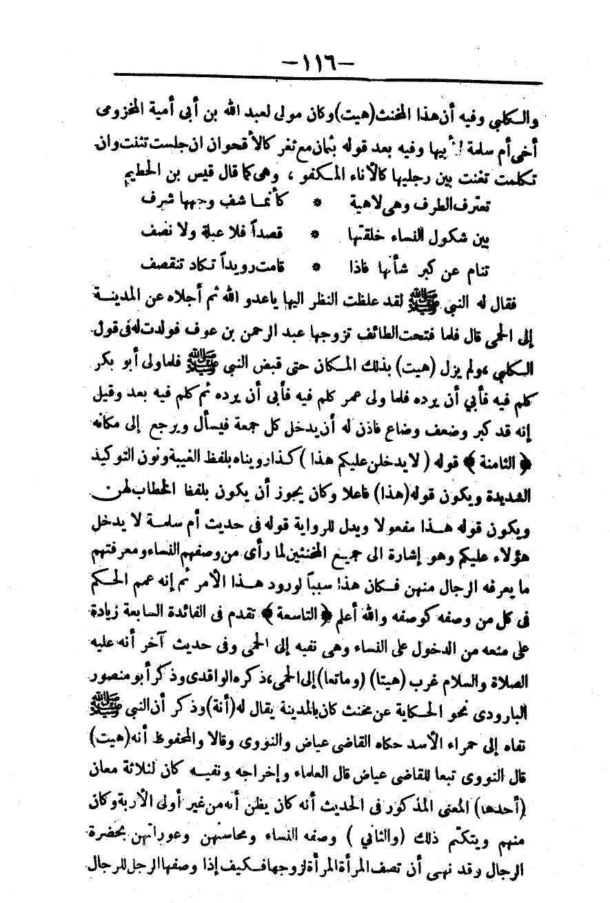 ـــــــــــــــــــــــــــــQوَالْكَلْبِيُّ وَفِيهِ أَنَّ هَذَا الْمُخَنَّثُ (هِيتٌ) : وَكَانَ مَوْلًى لِعَبْدِ اللَّهِ بْنِ أَبِي أُمَيَّةَ الْمَخْزُومِيِّ أَخِي أُمِّ سَلَمَةَ لِأَبِيهَا وَفِيهِ بَعْدَ قَوْلِهِ بِثَمَانٍ مَعَ ثَغْرٍ كَالْأُقْحُوَانِ إنْ جَلَسَتْ تَثَنَّتْ، وَإِنْ تَكَلَّمَتْ تَغَنَّتْ بَيْنَ رِجْلَيْهَا كَالْإِنَاءِ الْمَكْفُو، وَهِيَ كَمَا قَالَ قَيْسُ بْنُ الْخَطِيمِ