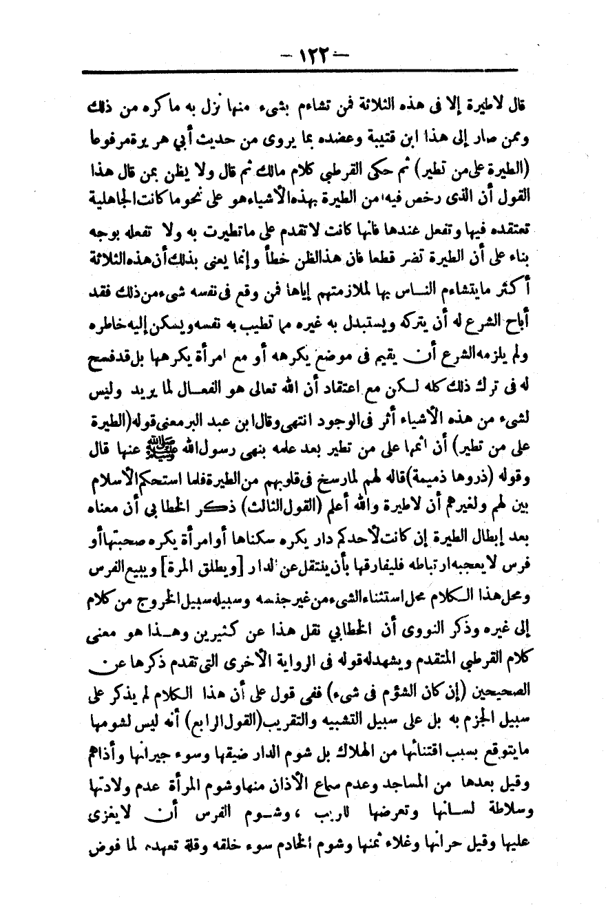 ثُمَّ حَكَى الْقُرْطُبِيُّ كَلَامَ مَالِكٍ ثُمَّ قَالَ: وَلَا يُظَنُّ بِمَنْ قَالَ: هَذَا الْقَوْلَ أَنَّ الَّذِي رَخَّصَ فِيهِ مِنْ الطِّيَرَةِ بِهَذِهِ الْأَشْيَاءِ هُوَ عَلَى نَحْوِ مَا كَانَتْ الْجَاهِلِيَّةُ تَعْتَقِدُهُ فِيهَا وَتَفْعَلُ عِنْدَهَا فَإِنَّهَا كَانَتْ لَا تَقْدَمُ عَلَى مَا تَطَيَّرَتْ بِهِ وَلَا تَفْعَلُهُ بِوَجْهٍ بِنَاءً عَلَى أَنَّ الطِّيَرَةَ تَضُرُّ قَطْعًا، فَإِنَّ هَذَا الظَّنَّ خَطَأٌ وَإِنَّمَا يَعْنِي بِذَلِكَ أَنَّ هَذِهِ الثَّلَاثَةَ أَكْثَرُ مَا يَتَشَاءَمُ النَّاسُ بِهَا لِمُلَازَمَتِهِمْ إيَّاهَا فَمَنْ وَقَعَ فِي نَفْسِهِ شَيْءٌ مِنْ ذَلِكَ فَقَدْ أَبَاحَ الشَّرْعَ لَهُ أَنْ يَتْرُكَهُ وَيَسْتَبْدِلَ بِهِ غَيْرَهُ مِمَّا تَطِيبُ بِهِ نَفْسُهُ وَيَسْكُنُ إلَيْهِ خَاطِرُهُ وَلَمْ يُلْزِمْهُ الشَّرْعُ أَنْ يُقِيمَ فِي مَوْضِعٍ يَكْرَهُهُ أَوْ مَعَ امْرَأَةٍ يَكْرَهُهَا بَلْ قَدْ فَسَّحَ لَهُ فِي تَرْكِ ذَلِكَ كُلِّهِ لَكِنْ مَعَ اعْتِقَادِ أَنَّ اللَّهَ تَعَالَى هُوَ الْفَعَّالُ لِمَا يُرِيدُ وَلَيْسَ لِشَيْءٍ مِنْ هَذِهِ الْأَشْيَاءِ أَثَرٌ فِي الْوُجُودِ انْتَهَى.