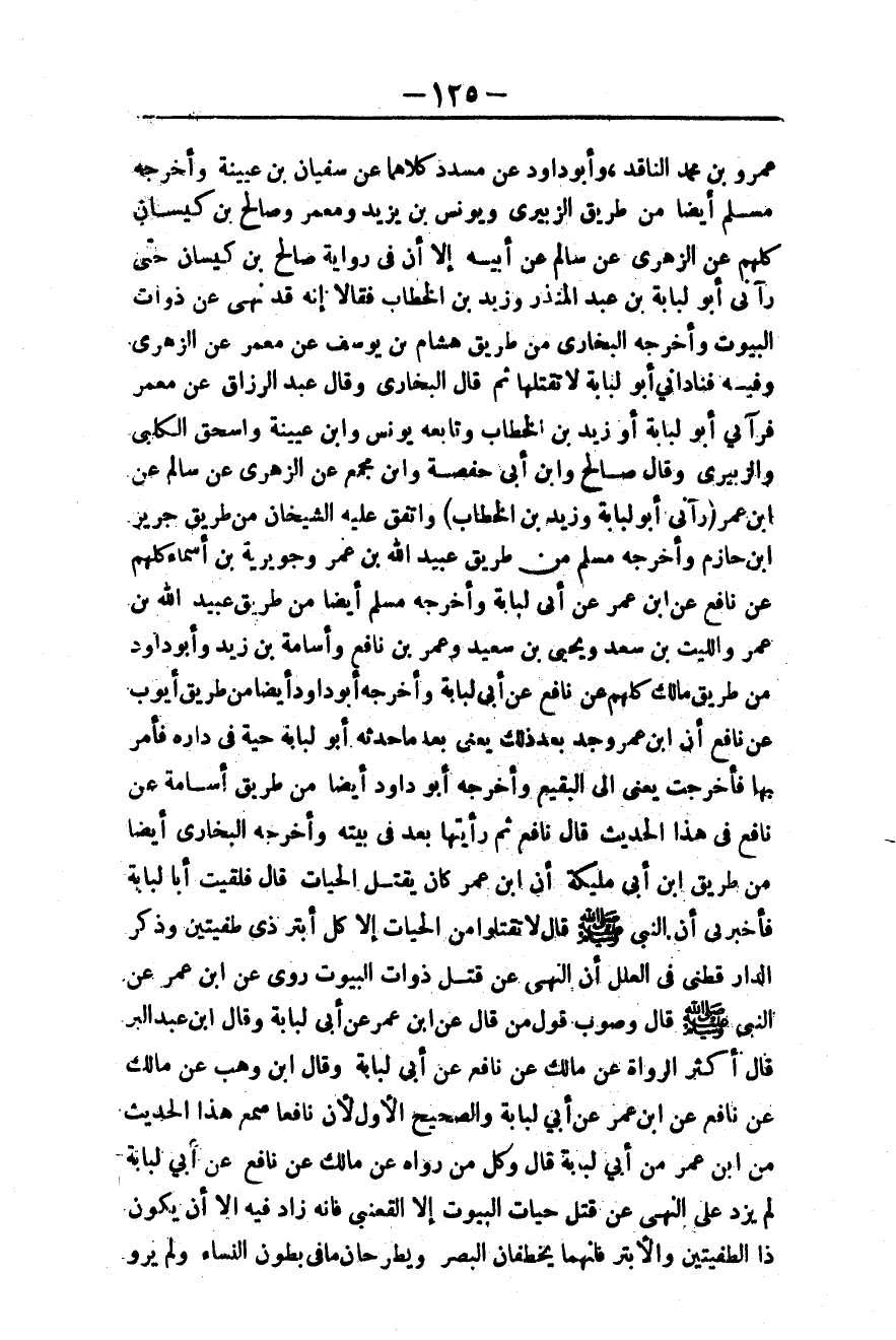 ـــــــــــــــــــــــــــــQعَمْرِو بْنِ مُحَمَّدٍ النَّاقِدِ، وَأَبُو دَاوُد عَنْ مُسَدَّدٍ كِلَاهُمَا عَنْ سُفْيَانَ بْنِ عُيَيْنَةَ وَأَخْرَجَهُ مُسْلِمٌ أَيْضًا مِنْ طَرِيقِ الزُّبَيْرِيِّ وَيُونُسَ بْنِ يَزِيدَ وَمَعْمَرٍ وَصَالِحِ بْنِ كَيْسَانَ كُلِّهِمْ عَنْ الزُّهْرِيِّ عَنْ سَالِمٍ عَنْ أَبِيهِ إلَّا أَنَّ فِي رِوَايَةِ صَالِحِ بْنِ كَيْسَانَ «حَتَّى رَآنِي أَبُو لُبَابَةَ بْنُ عَبْدِ الْمُنْذِرِ وَزَيْدُ بْنُ الْخَطَّابِ فَقَالَا: إنَّهُ قَدْ نُهِيَ عَنْ ذَوَاتِ الْبُيُوتِ» وَأَخْرَجَهُ الْبُخَارِيُّ مِنْ طَرِيقِ هِشَامِ بْنِ يُوسُفَ عَنْ مَعْمَرٍ عَنْ الزُّهْرِيِّ وَفِيهِ فَنَادَانِي أَبُو لُبَابَةَ لَا تَقْتُلْهَا، ثُمَّ قَالَ الْبُخَارِيُّ وَقَالَ عَبْدُ الرَّزَّاقِ عَنْ مَعْمَرٍ: فَرَآنِي أَبُو لُبَابَةَ أَوْ زَيْدُ بْنُ الْخَطَّابِ وَتَابَعَهُ يُونُسُ وَابْنُ عُيَيْنَةَ وَإِسْحَاقُ الْكَلْبِيُّ وَالزُّبَيْرِيُّ وَقَالَ صَالِحٌ وَابْنُ أَبِي حَفْصَةَ وَابْنُ مُجَمِّعٍ عَنْ الزُّهْرِيِّ عَنْ سَالِمٍ عَنْ ابْنِ عُمَرَ. (رَآنِي أَبُو لُبَابَةَ وَزَيْدُ بْنُ الْخَطَّابِ) وَاتَّفَقَ عَلَيْهِ الشَّيْخَانِ مِنْ طَرِيقِ جَرِيرِ بْنِ حَازِمٍ، وَأَخْرَجَهُ مُسْلِمٌ مِنْ طَرِيقِ عُبَيْدِ اللَّهِ بْنِ عُمَرَ وَجُوَيْرِيَةَ بْنِ أَسْمَاءَ كُلِّهِمْ عَنْ نَافِعٍ عَنْ ابْنِ عُمَرَ عَنْ أَبِي لُبَابَةَ وَأَخْرَجَهُ مُسْلِمٌ أَيْضًا مِنْ طَرِيقِ عُبَيْدِ اللَّهِ بْنِ عُمَرَ وَاللَّيْثِ بْنِ سَعْدٍ وَيَحْيَى بْنِ سَعِيدٍ وَعُمَرَ بْنِ نَافِعٍ وَأُسَامَةَ بْنِ زَيْدٍ وَأَبُو دَاوُد مِنْ طَرِيقِ مَالِكٍ كُلِّهِمْ عَنْ نَافِعٍ عَنْ أَبِي لُبَابَةَ وَأَخْرَجَهُ أَبُو دَاوُد أَيْضًا مِنْ طَرِيقِ أَيُّوبَ عَنْ نَافِعٍ أَنَّ ابْنَ عُمَرَ وَجَدَ بَعْدَ ذَلِكَ يَعْنِي بَعْدَ مَا حَدَّثَهُ أَبُو لُبَابَةَ حَيَّةً فِي دَارِهِ فَأَمَرَ بِهَا فَأُخْرِجَتْ يَعْنِي إلَى الْبَقِيعِ وَأَخْرَجَهُ أَبُو دَاوُد أَيْضًا مِنْ طَرِيقِ أُسَامَةَ عَنْ نَافِعٍ فِي هَذَا الْحَدِيثِ قَالَ نَافِعٌ ثُمَّ رَأَيْتهَا بَعْدُ فِي بَيْتِهِ وَأَخْرَجَهُ الْبُخَارِيُّ أَيْضًا مِنْ طَرِيقِ ابْنِ أَبِي مُلَيْكَةَ «أَنَّ ابْنَ عُمَرَ كَانَ يَقْتُلُ الْحَيَّاتِ قَالَ: فَلَقِيت أَبَا لُبَابَةَ فَأَخْبَرَنِي أَنَّ النَّبِيَّ - صَلَّى اللَّهُ عَلَيْهِ وَسَلَّمَ - قَالَ: لَا تَقْتُلُوا مِنْ الْحَيَّاتِ إلَّا كُلَّ أَبْتَرِ ذِي طُفْيَتَيْنِ» وَذَكَرَ الدَّارَقُطْنِيُّ فِي الْعِلَلِ أَنَّ النَّهْيَ عَنْ قَتْلِ ذَوَاتِ الْبُيُوتِ رُوِيَ عَنْ ابْنِ عُمَرَ عَنْ النَّبِيِّ - صَلَّى اللَّهُ عَلَيْهِ وَسَلَّمَ - قَالَ: وَصَوَّبَ قَوْلَ مَنْ قَالَ عَنْ ابْنِ عُمَرَ عَنْ أَبِي لُبَابَةَ وَقَالَ ابْنُ عَبْدِ الْبَرِّ قَالَ أَكْثَرُ الرُّوَاةِ عَنْ مَالِكٍ عَنْ نَافِعٍ عَنْ أَبِي لُبَابَةَ وَقَالَ ابْنُ وَهْبٍ عَنْ مَالِكٍ عَنْ نَافِعٍ عَنْ ابْنِ عُمَرَ عَنْ أَبِي لُبَابَةَ وَالصَّحِيحُ الْأَوَّلُ؛ لِأَنَّ نَافِعًا سَمِعَ هَذَا الْحَدِيثَ مِنْ ابْنِ عُمَرَ مِنْ أَبِي لُبَابَةَ قَالَ: وَكُلُّ مَنْ رَوَاهُ عَنْ مَالِكٍ عَنْ نَافِعٍ عَنْ أَبِي لُبَابَةَ لَمْ يَزِدْ عَلَى النَّهْيِ عَنْ قَتْلِ حَيَّاتِ الْبُيُوتِ إلَّا الْقَعْنَبِيُّ فَإِنَّهُ زَادَ فِيهِ إلَّا أَنْ يَكُونَ ذَا الطُّفْيَتَيْنِ وَالْأَبْتَرَ فَإِنَّهُمَا يَخْطَفَانِ الْبَصَرَ وَيَطْرَحَانِ مَا فِي بُطُونِ النِّسَاءِ وَلَمْ يَرْوِ