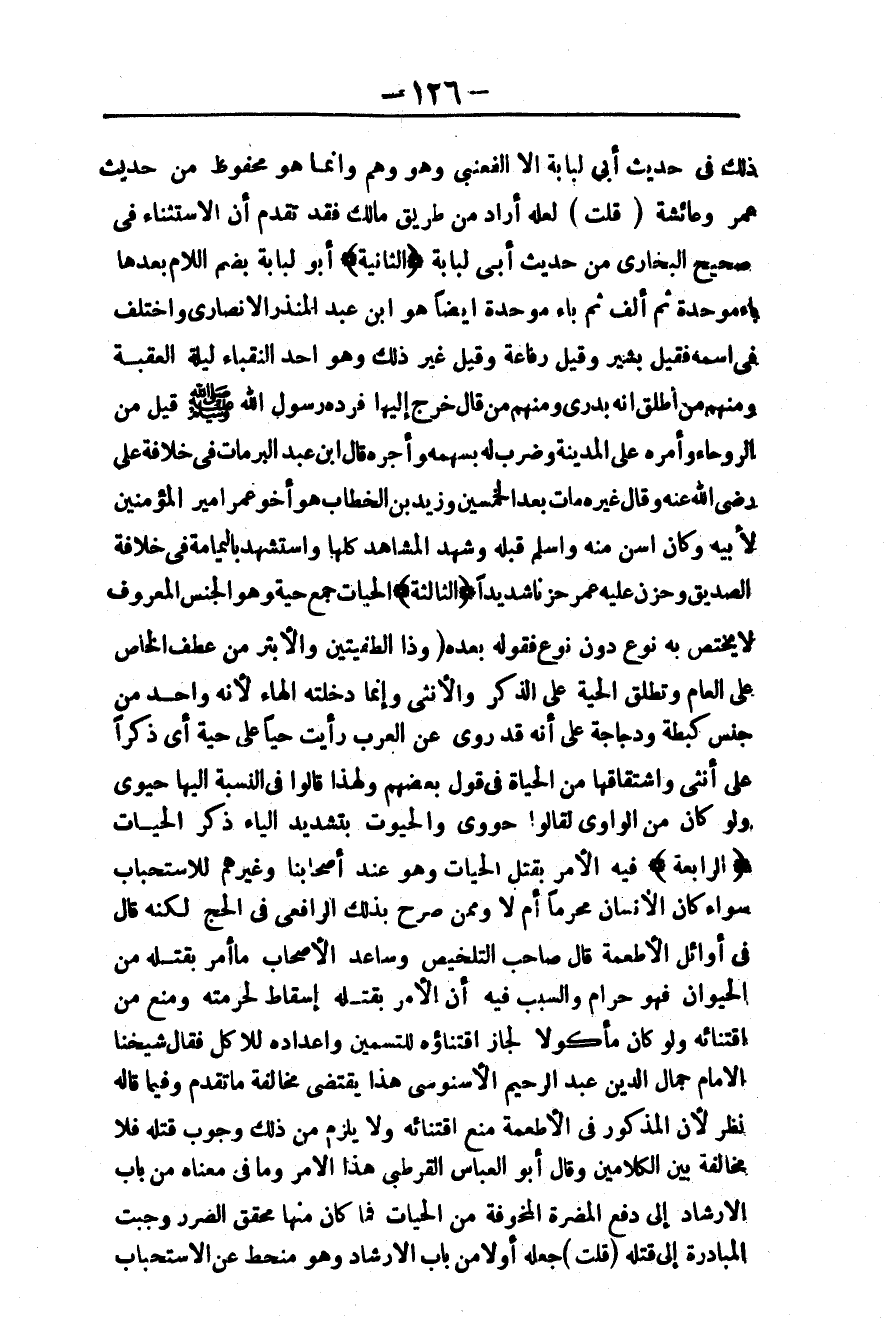 (الثَّالِثَةُ) الْحَيَّاتُ جَمْعُ حَيَّةٍ وَهُوَ الْجِنْسُ الْمَعْرُوفُ لَا يَخْتَصُّ بِهِ نَوْعٌ دُونَ نَوْعٍ فَقَوْلُهُ بَعْدَهُ (وَذَا الطُّفْيَتَيْنِ وَالْأَبْتَرَ) مِنْ عَطْفِ الْخَاصِّ عَلَى الْعَامِّ وَتُطْلَقُ الْحَيَّةُ عَلَى الذَّكَرِ وَالْأُنْثَى وَإِنَّمَا دَخَلَتْهُ الْهَاءُ؛ لِأَنَّهُ وَاحِدٌ مِنْ جِنْسٍ كَبَطَّةٍ وَدَجَاجَةٍ عَلَى أَنَّهُ قَدْ رُوِيَ عَنْ الْعَرَبِ رَأَيْت حَيًّا عَلَى حَيَّةٍ أَيْ ذَكَرًا عَلَى أُنْثَى وَاشْتِقَاقُهَا مِنْ الْحَيَاةِ فِي قَوْلِ بَعْضِهِمْ وَلِهَذَا قَالُوا فِي النِّسْبَةِ إلَيْهَا حَيَوِيٌّ وَلَوْ كَانَ مِنْ الْوَاوِيِّ لَقَالُوا: حَوَوِيٌّ وَالْحَيَّوْتُ بِتَشْدِيدِ الْيَاءِ ذَكَرُ الْحَيَّاتِ. .