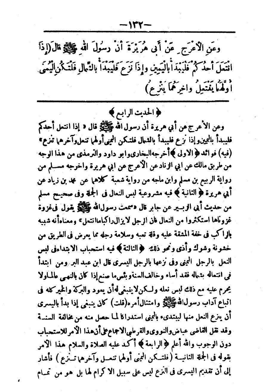 (الْحَدِيثُ الرَّابِعُ) وَعَنْ الْأَعْرَجِ عَنْ أَبِي هُرَيْرَةَ أَنَّ رَسُولَ اللَّهِ - صَلَّى اللَّهُ عَلَيْهِ وَسَلَّمَ - قَالَ «إذَا انْتَعَلَ أَحَدُكُمْ فَلْيَبْدَأْ بِالْيَمِينِ وَإِذَا نَزَعَ فَلْيَبْدَأْ بِالشِّمَالِ فَلْتَكُنْ الْيُمْنَى أُولَهُمَا تُنْعَلُ وَآخِرُهُمَا تُنْزَعُ» (فِيهِ) فَوَائِدُ: