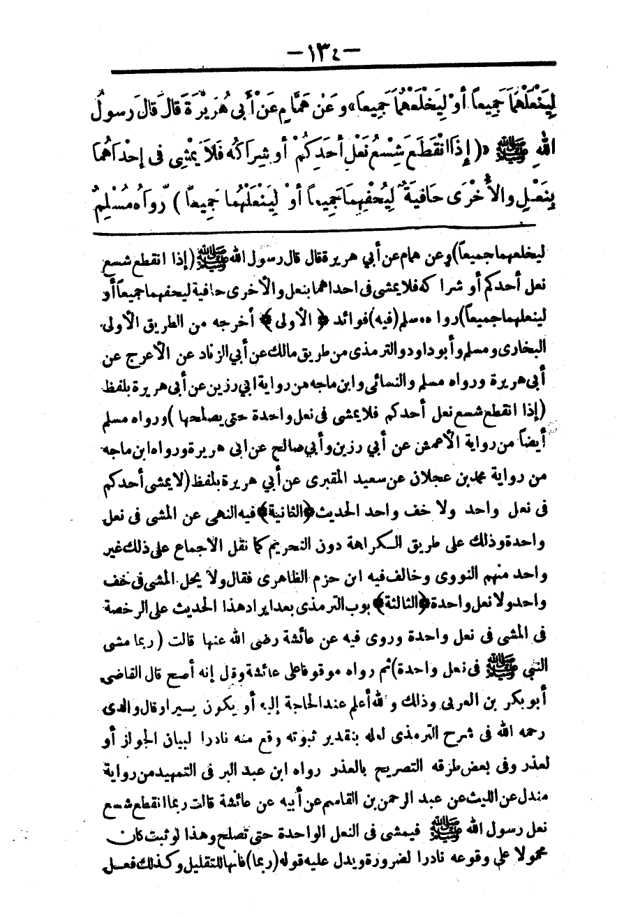 لِيُنْعِلْهُمَا جَمِيعًا أَوْ لِيَخْلَعْهُمَا جَمِيعًا» وَعَنْ هَمَّامٍ عَنْ أَبِي هُرَيْرَةَ قَالَ: قَالَ رَسُولُ اللَّهِ - صَلَّى اللَّهُ عَلَيْهِ وَسَلَّمَ - «إذَا انْقَطَعَ شِسْعُ نَعْلٍ أَحَدِكُمْ أَوْ شِرَاكُهُ فَلَا يَمْشِي فِي إحْدَاهُمَا بِنَعْلٍ وَالْأُخْرَى حَافِيَةٌ لِيُحْفِهِمَا جَمِيعًا أَوْ لِيُنْعِلْهُمَا جَمِيعًا» رَوَاهُ مُسْلِمٌ.