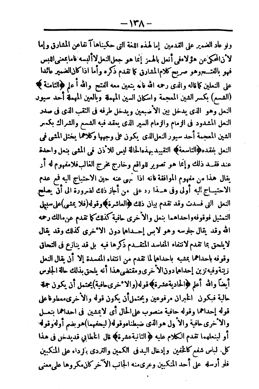 (الْحَادِيَةَ عَشْرَةَ) قَوْلُهُ «وَالْأُخْرَى حَافِيَةٌ» يَحْتَمِلُ أَنْ يَكُونَ جُمْلَةً حَالِيَّةً فَيَكُونَ الْخَبَرَانِ مَرْفُوعَيْنِ وَيَحْتَمِلُ أَنْ يَكُونَ قَوْلُهُ وَالْأُخْرَى مَعْطُوفًا عَلَى قَوْلِهِ إحْدَاهُمَا وَقَوْلُهُ: حَافِيَةً، مَنْصُوبٌ عَلَى الْحَالِ أَيْ لَا يَمْشِيَنَّ فِي إحْدَاهُمَا بِنَعْلٍ وَالْأُخْرَى حَافِيَةً وَالْأَوَّلُ هُوَ الَّذِي ضَبَطْنَاهُ وَقَوْلُهُ «لِيُحْفِهِمَا» هُوَ بِضَمِّ أَوَّلِهِ، وَقَوْلُهُ أَوْ لِيُنْعِلْهُمَا تَقَدَّمَ الْكَلَامُ عَلَيْهِ.