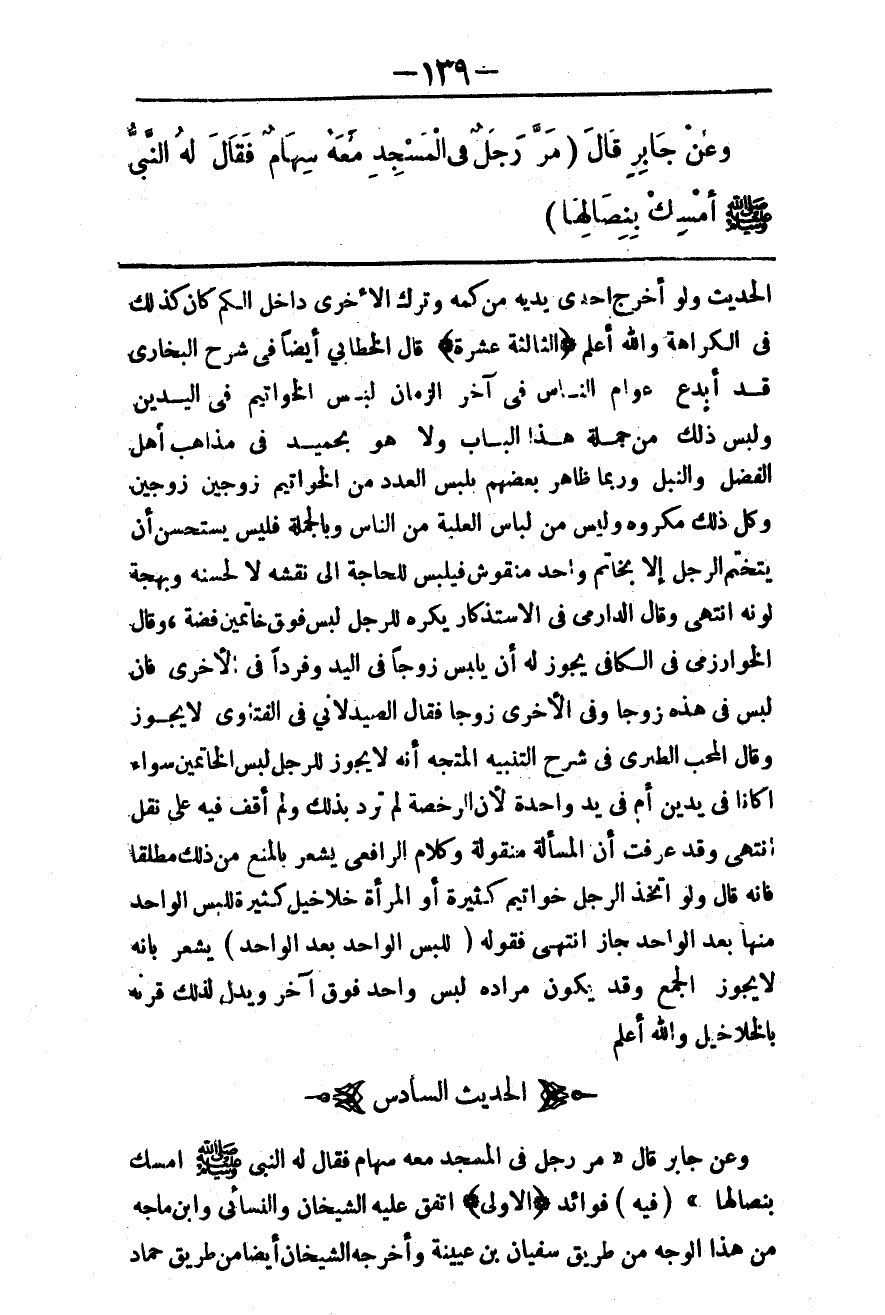(الْحَدِيثُ السَّادِسُ) وَعَنْ جَابِرٍ قَالَ «مَرَّ رَجُلٌ فِي الْمَسْجِدِ مَعَهُ سِهَامٌ فَقَالَ لَهُ النَّبِيُّ - صَلَّى اللَّهُ عَلَيْهِ وَسَلَّمَ -: أَمْسِكْ بِنِصَالِهَا» (فِيهِ) فَوَائِدُ: