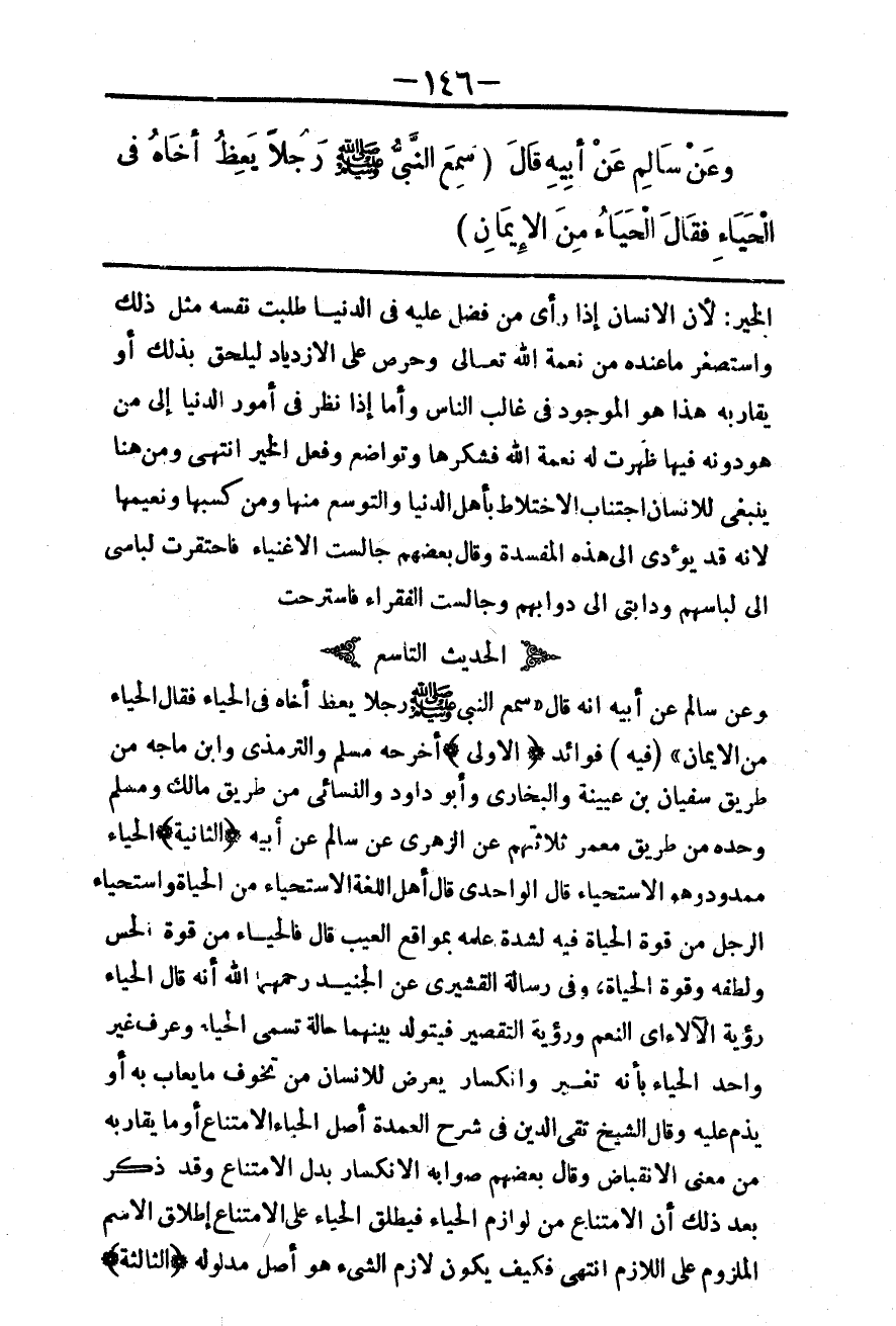 (الْحَدِيثُ التَّاسِعُ) وَعَنْ سَالِمٍ عَنْ أَبِيهِ أَنَّهُ قَالَ «سَمِعَ النَّبِيُّ - صَلَّى اللَّهُ عَلَيْهِ وَسَلَّمَ - رَجُلًا يَعِظُ أَخَاهُ فِي الْحَيَاءِ، فَقَالَ: الْحَيَاءُ مِنْ الْإِيمَانٍ» (فِيهِ) فَوَائِدُ: