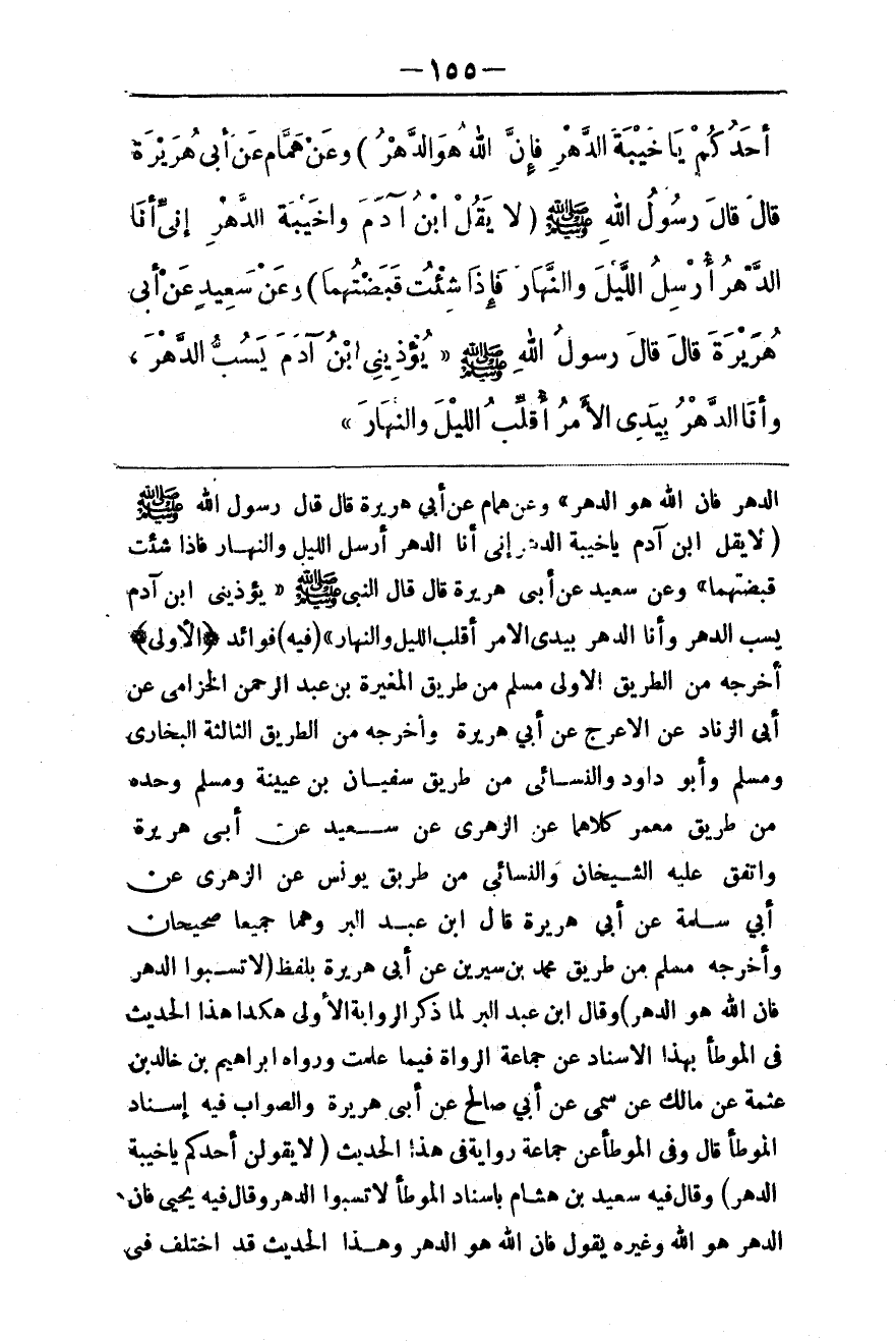 أَحَدُكُمْ: يَا خَيْبَةَ الدَّهْرِ فَإِنَّ اللَّهَ هُوَ الدَّهْرُ» وَعَنْ هَمَّامٍ عَنْ أَبِي هُرَيْرَةَ قَالَ: قَالَ رَسُولُ اللَّهِ - صَلَّى اللَّهُ عَلَيْهِ وَسَلَّمَ -: «لَا يَقُلْ ابْنُ آدَمَ وَا خَيْبَةَ الدَّهْرِ إنِّي أَنَا الدَّهْرُ أُرْسِلُ اللَّيْلَ وَالنَّهَارَ فَإِذَا شِئْت قَبَضْتُهُمَا» .