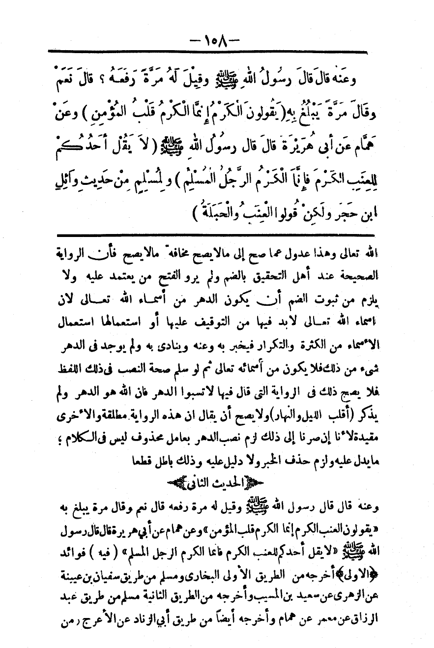 (الْحَدِيثُ الثَّانِي) وَعَنْهُ قَالَ «قَالَ رَسُولُ اللَّهِ - صَلَّى اللَّهُ عَلَيْهِ وَسَلَّمَ - وَقِيلَ لَهُ مَرَّةً رَفَعَهُ قَالَ نَعَمْ وَقَالَ مَرَّةً يَبْلُغُ بِهِ يَقُولُونَ الْعِنَبُ الْكَرْمُ إنَّمَا الْكَرْمُ قَلْبُ الْمُؤْمِنِ» وَعَنْ هَمَّامٍ عَنْ أَبِي هُرَيْرَةَ قَالَ: قَالَ رَسُولُ اللَّهِ: - صَلَّى اللَّهُ عَلَيْهِ وَسَلَّمَ - «لَا يَقُلْ أَحَدُكُمْ لِلْعِنَبِ الْكَرْمَ فَإِنَّمَا الْكَرْمُ الرَّجُلُ الْمُسْلِمُ» (فِيهِ) فَوَائِدُ: