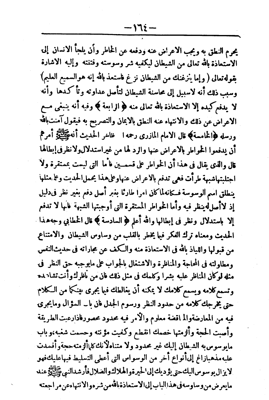 وَبَابُ مَا يُوَسْوِسُ بِهِ الشَّيْطَانُ إلَيْك غَيْرُ مَحْدُودٍ وَلَا مُتَنَاهٍ؛ لِأَنَّك كُلَّمَا أَلْزَمْته حُجَّةً وَأَفْسَدْت عَلَيْهِ مَذْهَبًا زَاغَ إلَى أَنْوَاعٍ أُخَرَ مِنْ الْوَسْوَاسِ الَّتِي أُعْطِيَ التَّسْلِيطَ فِيهَا عَلَيْك، فَهُوَ لَا يَزَالُ يُوَسْوِسُ إلَيْك حَتَّى يُؤَدِّيَك إلَى الْحِيرَةِ وَالْهَلَاكِ وَالضَّلَالِ فَأَرْشَدَ النَّبِيُّ - صَلَّى اللَّهُ عَلَيْهِ وَسَلَّمَ - عِنْدَ مَا يَعْرِضُ مِنْ وَسَاوِسِهِ فِي هَذَا الْبَابِ إلَى الِاسْتِعَاذَةِ بِاَللَّهِ مِنْ شَرِّهِ وَالِانْتِهَاءِ عَنْ مُرَاجَعَتِهِ