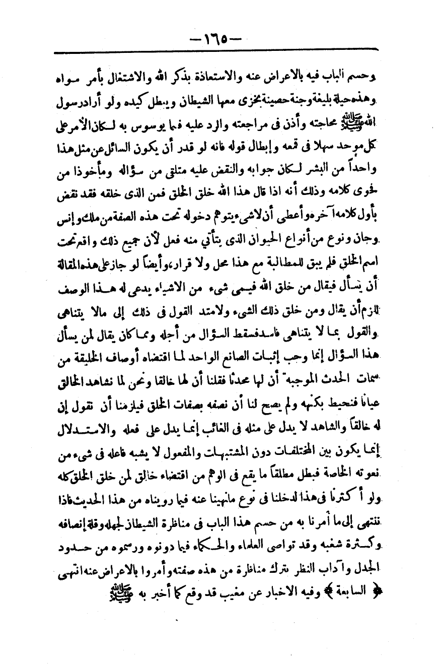 وَالشَّاهِدُ لَا يَدُلُّ عَلَى مِثْلِهِ فِي الْغَائِبِ إنَّمَا يَدُلُّ عَلَى فِعْلِهِ وَالِاسْتِدْلَالُ إنَّمَا يَكُونُ بَيْنَ الْمُخْتَلِفَاتِ دُونَ الْمُشْتَبِهَاتِ، وَالْمَفْعُولُ لَا يُشْبِهُ فَاعِلَهُ فِي شَيْءٍ مِنْ نُعُوتِهِ الْخَاصَّةِ فَبَطَلَ مُطْلَقًا مَا يَقَعُ فِي الْوَهْمِ مِنْ اقْتِضَاءِ خَالِقٍ لِمَنْ خَلَقَ الْخَلْقَ كُلَّهُ، وَلَوْ أَكْثَرْنَا فِي هَذَا لَدَخَلْنَا فِي نَوْعِ مَا نُهِينَا عَنْهُ فِيمَا رَوَيْنَاهُ مِنْ هَذَا الْحَدِيثِ، فَإِذًا نَنْتَهِي إلَى مَا أُمِرْنَا بِهِ مِنْ حَسْمِ هَذَا الْبَابِ فِي مُنَاظَرَةِ الشَّيْطَانِ لِجَهْلِهِ وَقِلَّةِ إنْصَافِهِ وَكَثْرَةِ شَغَبِهِ، وَقَدْ تَوَاصَى الْعُلَمَاءُ وَالْحُكَمَاءُ فِيمَا دَوَّنُوهُ وَرَسَمُوهُ مِنْ حُدُودِ الْجَدَلِ وَآدَابِ النَّظَرِ بِتَرْكِ مُنَاظَرَةِ مَنْ هَذِهِ صِفَتُهُ، وَأَمَرُوا بِالْإِعْرَاضِ عَنْهُ انْتَهَى.