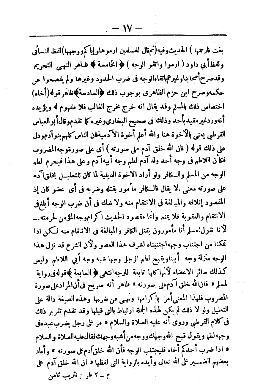 (الْخَامِسَةُ) : ظَاهِرُ النَّهْيِ التَّحْرِيمُ وَقَدْ صَرَّحَ أَصْحَابُنَا وَغَيْرُهُمْ بِاتِّقَاءِ الْوَجْهِ فِي ضَرْبِ الْحُدُودِ وَغَيْرِهَا وَلَمْ يُفْصِحُوا عَنْ حُكْمِهِ وَصَرَّحَ ابْنُ حَزْمٍ الظَّاهِرِيُّ بِوُجُوبِ ذَلِكَ.