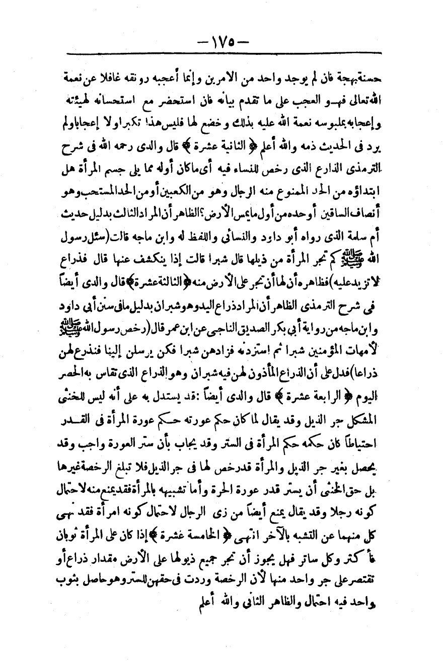 (الثَّانِيَةَ عَشْرَةَ) قَالَ وَالِدِي - رَحِمَهُ اللَّهُ - فِي شَرْحِ التِّرْمِذِيِّ: الذِّرَاعُ الَّذِي رَخَّصَ لِلنِّسَاءِ فِيهِ أَيْ مَا كَانَ أَوَّلُهُ مِمَّا يَلِي جِسْمَ الْمَرْأَةِ هَلْ ابْتِدَاؤُهُ مِنْ الْحَدِّ الْمَمْنُوعِ مِنْهُ الرِّجَالُ، وَهُوَ مِنْ الْكَعْبَيْنِ أَوْ مِنْ الْحَدِّ الْمُسْتَحَبِّ، وَهُوَ أَنْصَافُ السَّاقَيْنِ أَوْ حَدُّهُ مِنْ أَوَّلِ مَا يَمَسُّ الْأَرْضَ؟ الظَّاهِرُ أَنَّ الْمُرَادَ الثَّالِثُ بِدَلِيلِ حَدِيثِ أُمِّ سَلَمَةَ الَّذِي رَوَاهُ أَبُو دَاوُد وَالنَّسَائِيُّ وَاللَّفْظُ لَهُ وَابْنُ مَاجَهْ قَالَتْ «سُئِلَ رَسُولُ اللَّهِ - صَلَّى اللَّهُ عَلَيْهِ وَسَلَّمَ - كَمْ تَجُرُّ الْمَرْأَةُ مِنْ ذَيْلِهَا قَالَ شِبْرًا قَالَتْ: إذًا يَنْكَشِفُ عَنْهَا قَالَ فَذِرَاعٌ لَا تَزِيدُ عَلَيْهِ» فَظَاهِرُهُ أَنَّ لَهَا أَنْ تَجُرَّ عَلَى الْأَرْضِ مِنْهُ (الثَّالِثَةَ عَشْرَةَ) قَالَ وَالِدِي أَيْضًا فِي شَرْحِ التِّرْمِذِيِّ الظَّاهِرُ أَنَّ الْمُرَادَ ذِرَاعُ الْيَدِ، وَهُوَ شِبْرَانِ بِدَلِيلِ مَا فِي سُنَنِ أَبِي دَاوُد وَابْنِ مَاجَهْ مِنْ رِوَايَةِ أَبِي بَكْرٍ الصِّدِّيقِ النَّاجِي عَنْ ابْنِ عُمَرَ قَالَ «رَخَّصَ رَسُولُ اللَّهِ - صَلَّى اللَّهُ عَلَيْهِ وَسَلَّمَ - لِأُمَّهَاتِ الْمُؤْمِنِينَ شِبْرًا، ثُمَّ اسْتَزَدْنَهُ فَزَادَهُنَّ شِبْرًا فَكُنَّ يُرْسِلْنَ إلَيْنَا فَنَذْرَعُ لَهُنَّ ذِرَاعًا» فَدَلَّ عَلَى أَنَّ الذِّرَاعَ الْمَأْذُونَ لَهُنَّ فِيهِ شِبْرَانِ، وَهُوَ الذِّرَاعُ الَّذِي تُقَاسُ بِهِ الْحُصْرُ الْيَوْمَ.