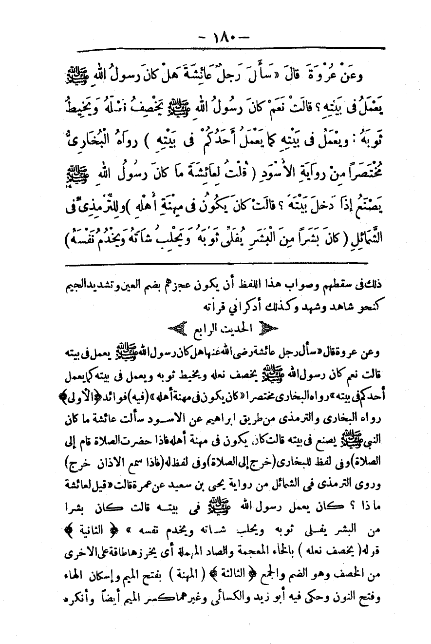 (الْحَدِيثُ الرَّابِعُ) وَعَنْ عُرْوَةَ قَالَ «سَأَلَ رَجُلٌ عَائِشَةَ - رَضِيَ اللَّهُ عَنْهَا - هَلْ كَانَ رَسُولُ اللَّهِ - صَلَّى اللَّهُ عَلَيْهِ وَسَلَّمَ - يَعْمَلُ فِي بَيْتِهِ قَالَتْ نَعَمْ كَانَ رَسُولُ اللَّهِ - صَلَّى اللَّهُ عَلَيْهِ وَسَلَّمَ - يَخْصِفُ نَعْلَهُ وَيَخِيطُ ثَوْبَهُ وَيَعْمَلُ فِي بَيْتِهِ كَمَا يَعْمَلُ أَحَدُكُمْ فِي بَيْتِهِ» رَوَاهُ الْبُخَارِيُّ مُخْتَصَرًا «كَانَ يَكُونُ فِي مِهْنَةِ أَهْلِهِ» (فِيهِ) فَوَائِدُ: