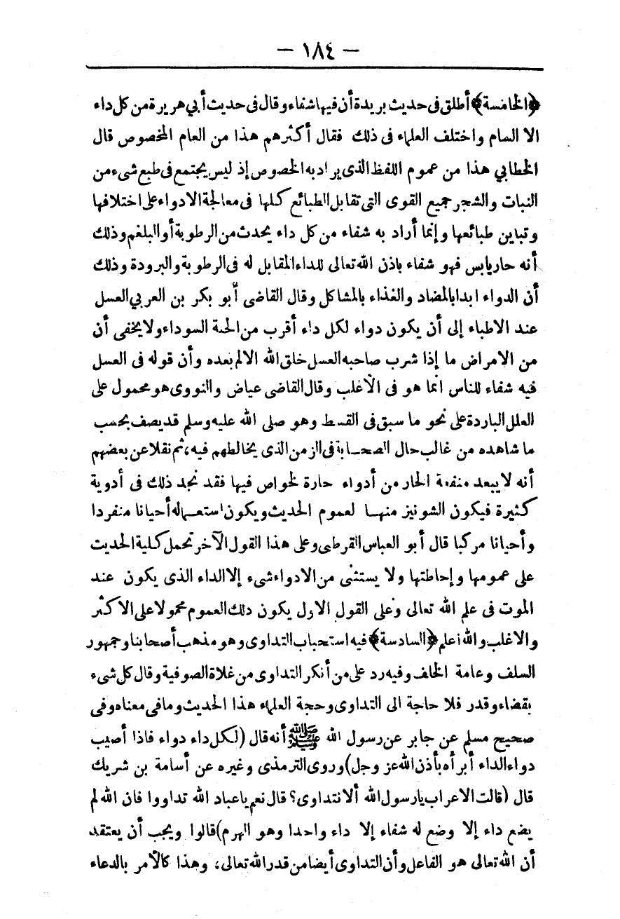 ـــــــــــــــــــــــــــــQ (الْخَامِسَةُ) أَطْلَقَ فِي حَدِيثِ بُرَيْدَةَ أَنَّ فِيهَا شِفَاءً وَقَالَ فِي حَدِيثِ أَبِي هُرَيْرَةَ مِنْ كُلِّ دَاءٍ إلَّا السَّامَ، وَاخْتَلَفَ الْعُلَمَاءُ فِي ذَلِكَ فَقَالَ أَكْثَرُهُمْ هَذَا مِنْ الْعَامِّ الْمَخْصُوصِ قَالَ الْخَطَّابِيُّ هَذَا مِنْ عُمُومِ اللَّفْظِ الَّذِي يُرَادُ بِهِ الْخُصُوصُ إذْ لَيْسَ يَجْتَمِعُ فِي طَبْعِ شَيْءٍ مِنْ النَّبَاتِ وَالشَّجَرِ جَمِيعُ الْقُوَى الَّتِي تُقَابِلُ الطَّبَائِعَ كُلَّهَا فِي مُعَالَجَةِ الْأَدْوَاءِ عَلَى اخْتِلَافِهَا وَتَبَايُنِ طَبَائِعِهَا، وَإِنَّمَا أَرَادَ بِهِ شِفَاءً مِنْ كُلِّ دَاءٍ يَحْدُثُ مِنْ الرُّطُوبَةِ أَوْ الْبَلْغَمِ، وَذَلِكَ أَنَّهُ حَارٌّ يَابِسٌ فَهُوَ شِفَاءٌ بِإِذْنِ اللَّهِ تَعَالَى لِلدَّاءِ الْمُقَابِلِ لَهُ فِي الرُّطُوبَةِ وَالْبُرُودَةِ، وَذَلِكَ أَنَّ الدَّوَاءَ أَبَدًا بِالْمُضَادِّ وَالْغِذَاءَ بِالْمُشَاكِلِ.