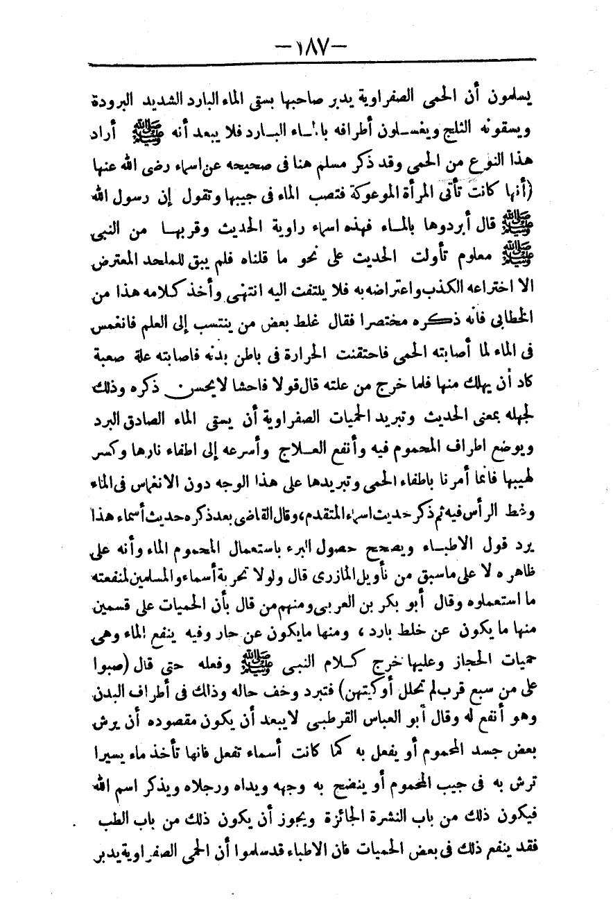 ـــــــــــــــــــــــــــــQيُسَلِّمُونَ أَنَّ الْحُمَّى الصَّفْرَاوِيَّةَ يُدَبَّرُ صَاحِبُهَا بِسَقْيِ الْمَاءِ الْبَارِدِ الشَّدِيدِ الْبُرُودَةِ، وَيَسْقُونَهُ الثَّلْجَ وَيَغْسِلُونَ أَطْرَافَهُ بِالْمَاءِ الْبَارِدِ فَلَا يَبْعُدُ أَنَّهُ - صَلَّى اللَّهُ عَلَيْهِ وَسَلَّمَ - أَرَادَ هَذَا النَّوْعَ مِنْ الْحُمَّى، وَقَدْ ذَكَرَ مُسْلِمٌ هُنَا فِي صَحِيحِهِ عَنْ أَسْمَاءَ - رَضِيَ اللَّهُ عَنْهَا - «أَنَّهَا كَانَتْ تَأْتِي الْمَرْأَةَ الْمَوْعُوكَةَ فَتَصُبُّ الْمَاءَ فِي جَيْبِهَا وَتَقُولُ: إنَّ رَسُولَ اللَّهِ - صَلَّى اللَّهُ عَلَيْهِ وَسَلَّمَ - قَالَ أَبْرِدُوهَا بِالْمَاءِ» فَهَذِهِ أَسْمَاءُ رَاوِيَةُ الْحَدِيثِ، وَقُرْبُهَا مِنْ النَّبِيِّ - صَلَّى اللَّهُ عَلَيْهِ وَسَلَّمَ - مَعْلُومٌ تَأَوَّلَتْ الْحَدِيثَ عَلَى نَحْوِ مَا قُلْنَاهُ فَلَمْ يَبْقَ لِلْمُلْحِدِ الْمُعْتَرِضِ إلَّا اخْتِرَاعُهُ الْكَذِبَ وَاعْتِرَاضُهُ بِهِ فَلَا يُلْتَفَتُ إلَيْهِ انْتَهَى.