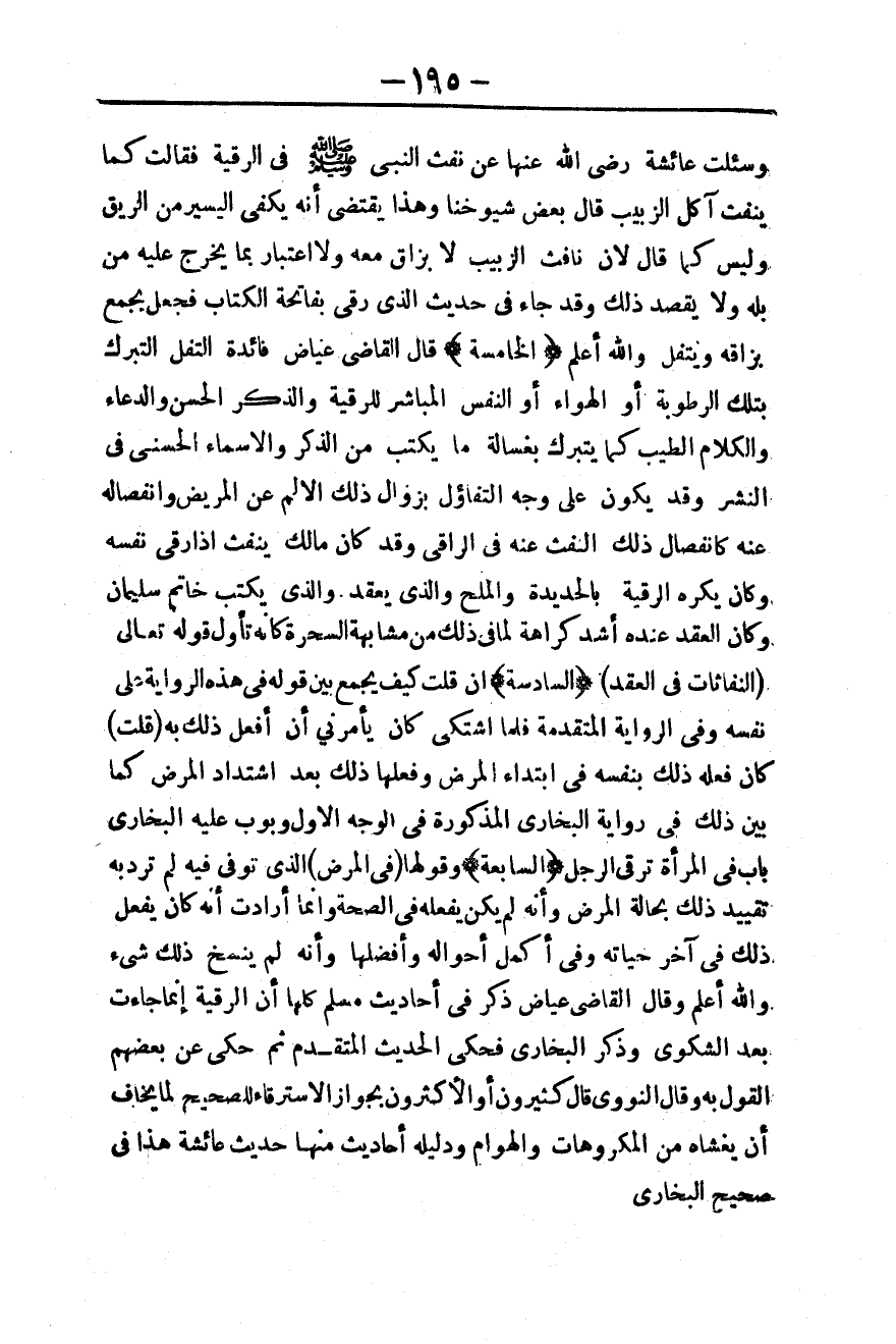 ـــــــــــــــــــــــــــــQ «وَسُئِلَتْ عَائِشَةُ - رَضِيَ اللَّهُ عَنْهَا - عَنْ نَفْثِ النَّبِيِّ - صَلَّى اللَّهُ عَلَيْهِ وَسَلَّمَ - فِي الرُّقْيَةِ فَقَالَتْ كَمَا يَنْفِثُ آكِلُ الزَّبِيبِ» قَالَ بَعْضُ شُيُوخِنَا: وَهَذَا يَقْتَضِي أَنَّهُ يَكْفِي الْيَسِيرُ مِنْ الرِّيقِ وَلَيْسَ كَمَا قَالَ؛ لِأَنَّ نَافِثَ الزَّبِيبِ لَا بُزَاقَ مَعَهُ وَلَا اعْتِبَارَ بِمَا يَخْرُجُ عَلَيْهِ مِنْ بَلِّهِ وَلَا يَقْصِدُ ذَلِكَ وَقَدْ جَاءَ فِي حَدِيثِ الَّذِي رَقَى بِفَاتِحَةِ الْكِتَابِ فَجَعَلَ يَجْمَعُ بُزَاقَهُ وَيَتْفُلُ وَاَللَّهُ أَعْلَمُ.